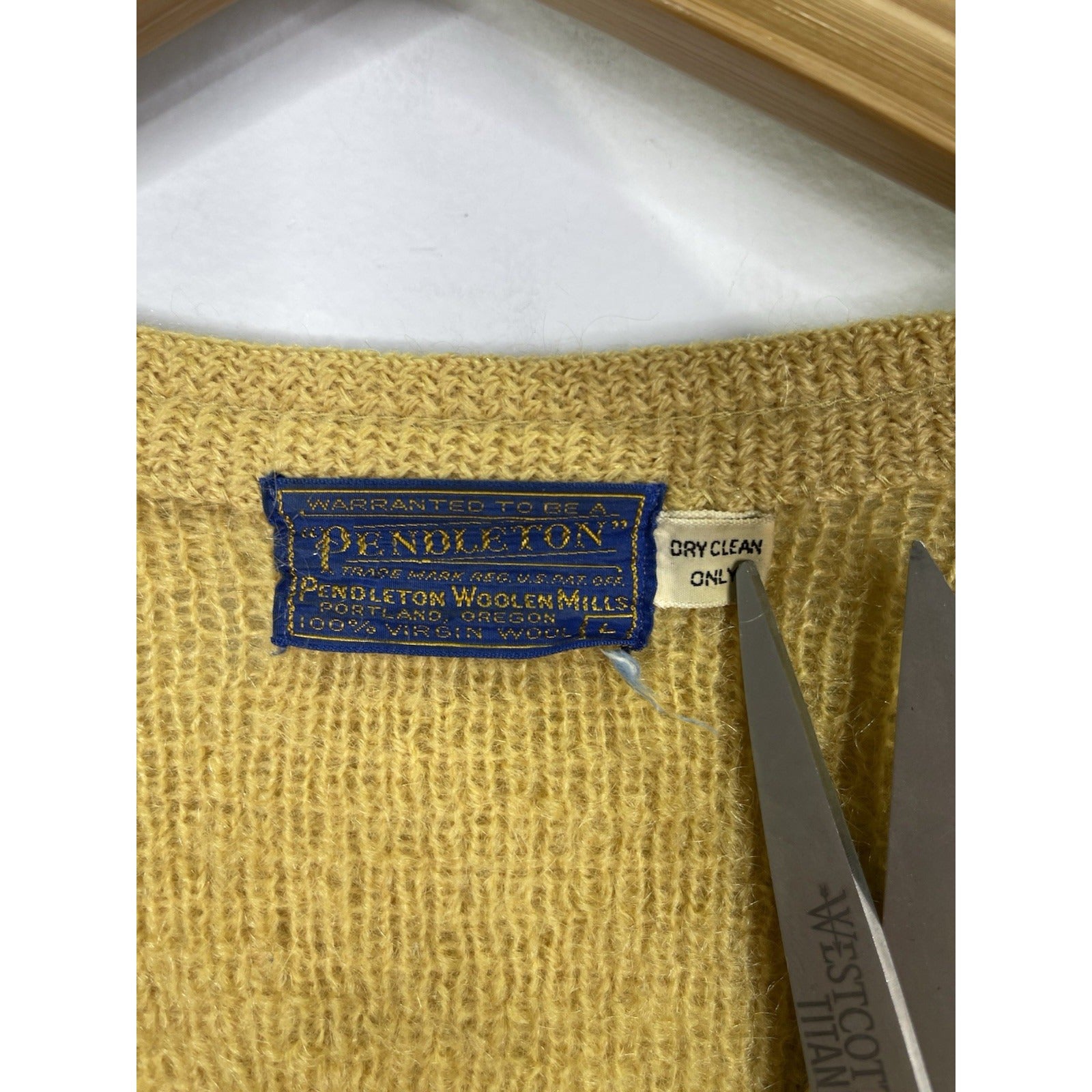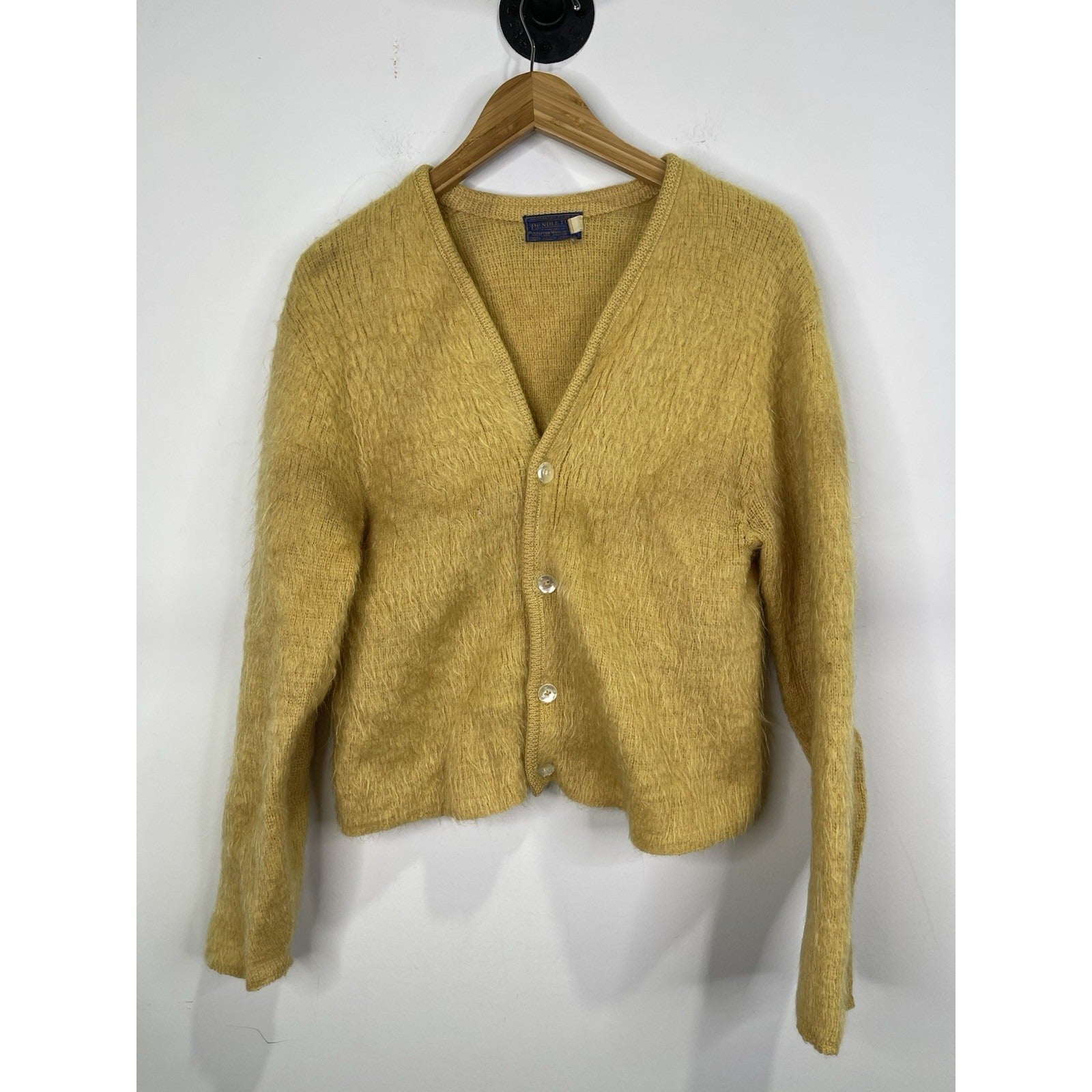 This Women's VTG Pendleton Yellow 100% Virgin Wool Button Up Cardigan in size Large is a stylish and vintage piece perfect for a casual occasion. Made in the United States, this sweater features a round neck, long sleeves, and a regular fit. The vibrant yellow color and classic button accents add a pop of personality to the garment, making it a versatile addition to any woman's wardrobe. Made from high-quality wool, this cardigan requires special care with dry cleaning only to maintain its quality and appearance.