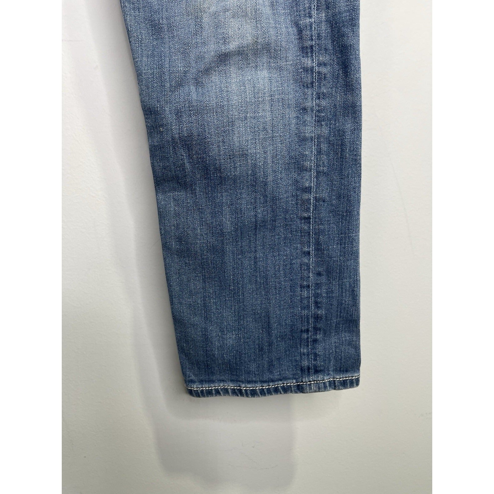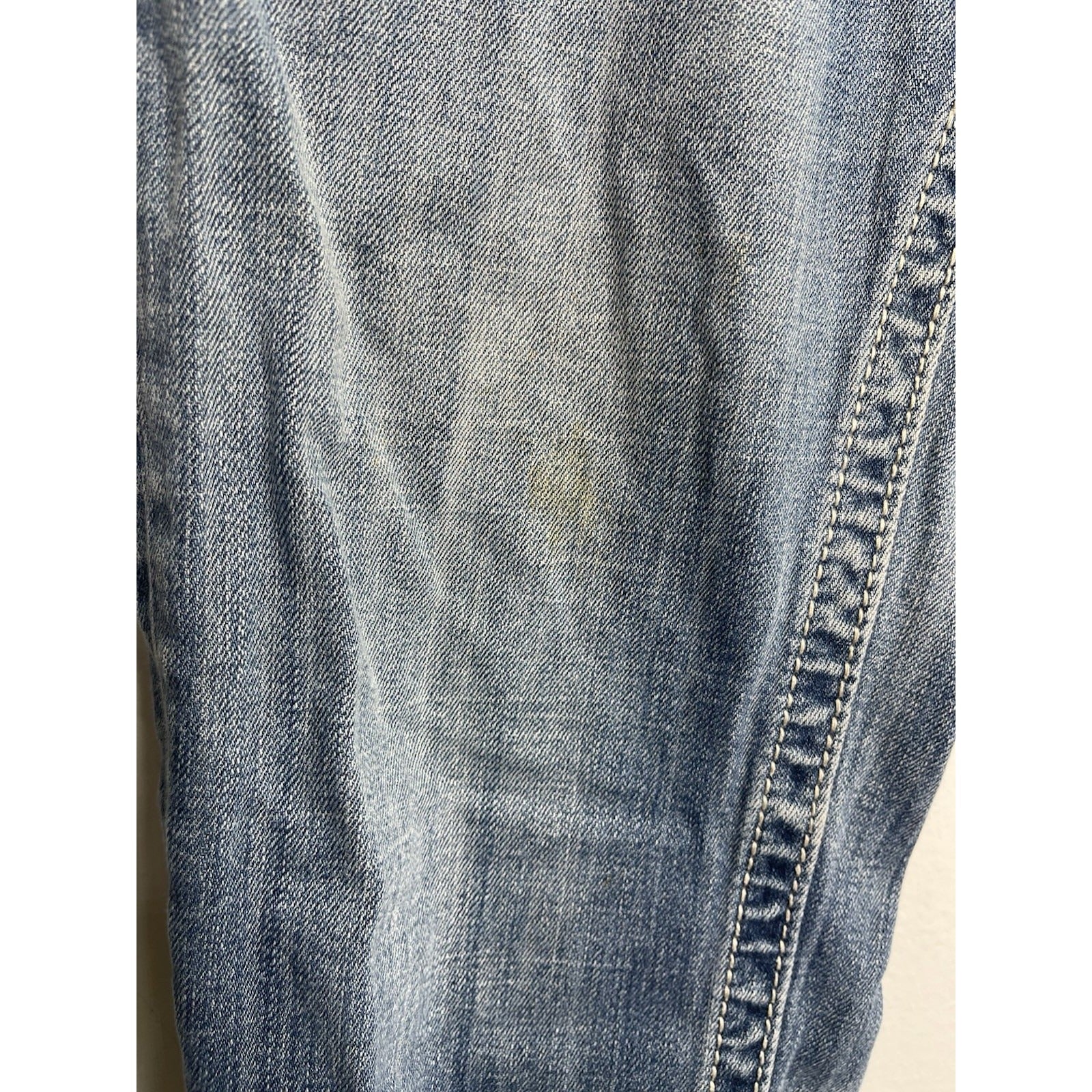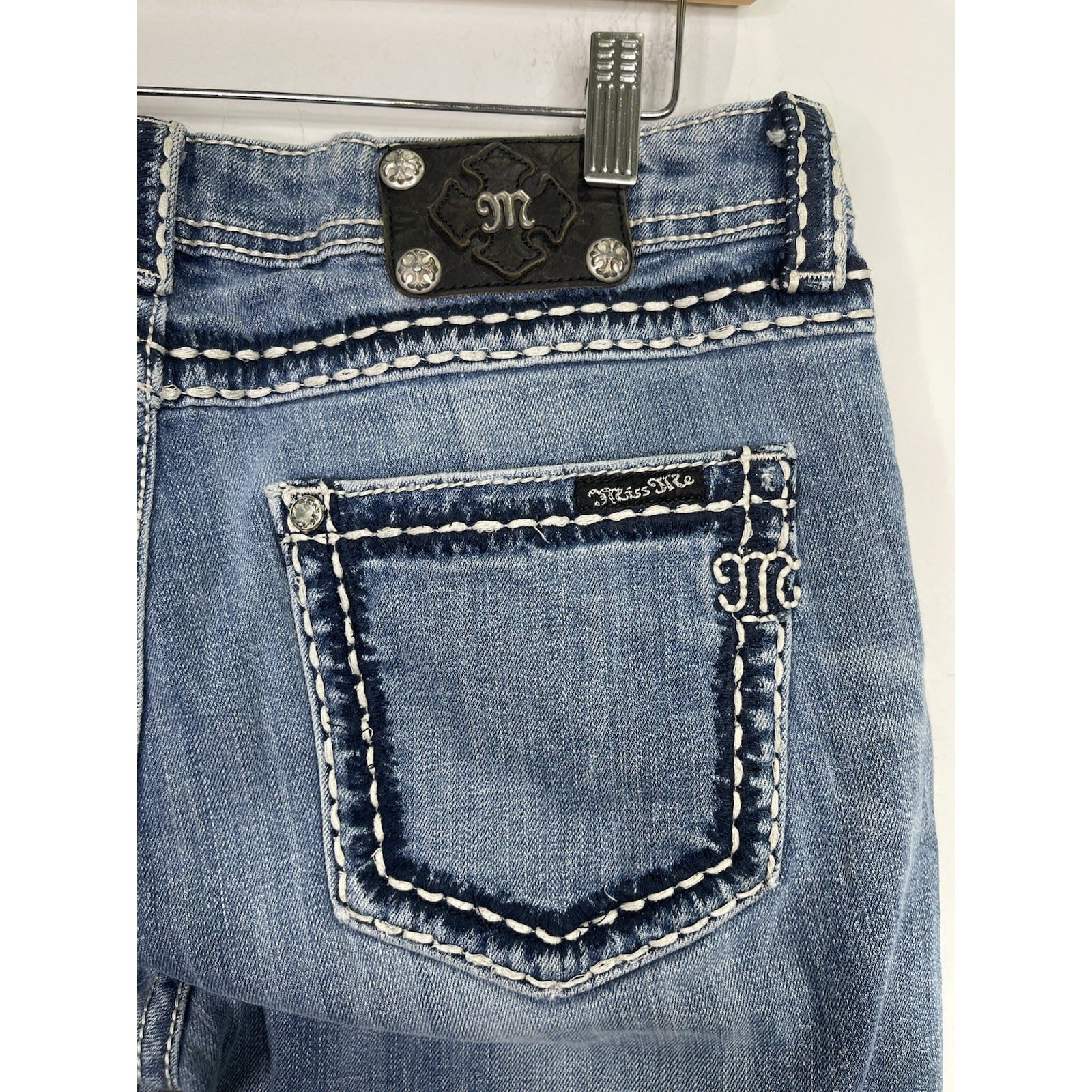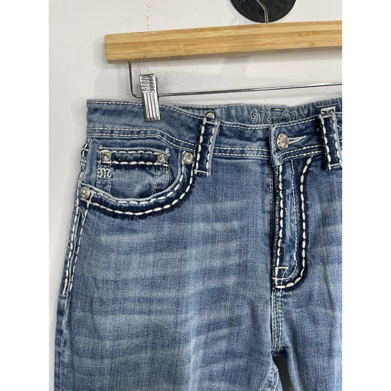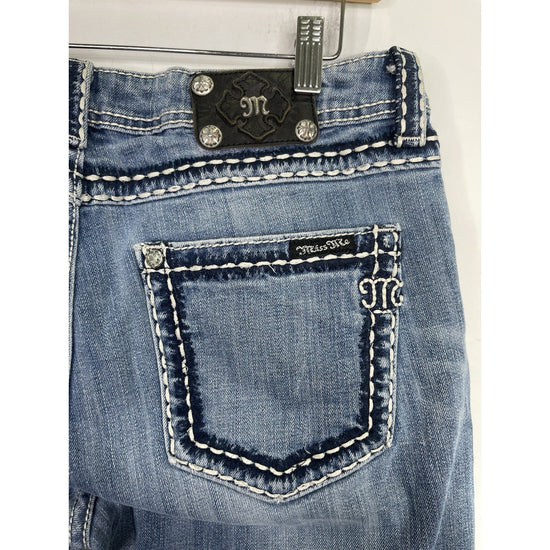 These Women’s Y2K Blue Miss Me Jeans offer a trendy and stylish look with their Boyfriend Capri length and Rhinestone Pockets. Made of cotton denim in a solid blue color, these jeans feature a zip closure and medium fabric wash. The bootcut style and embroidered logo accents add to the overall aesthetic, making them a fashionable choice for any woman's wardrobe. With a waist size of 30 inches and inseam of 25 inches, these jeans are comfortable and on-trend for everyday wear.