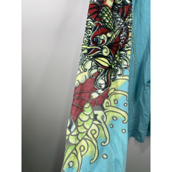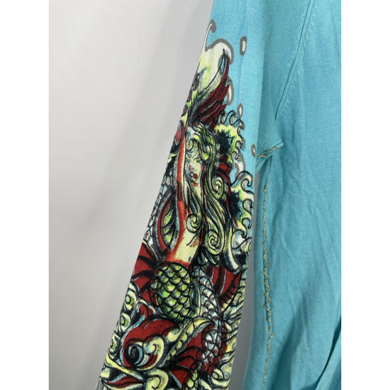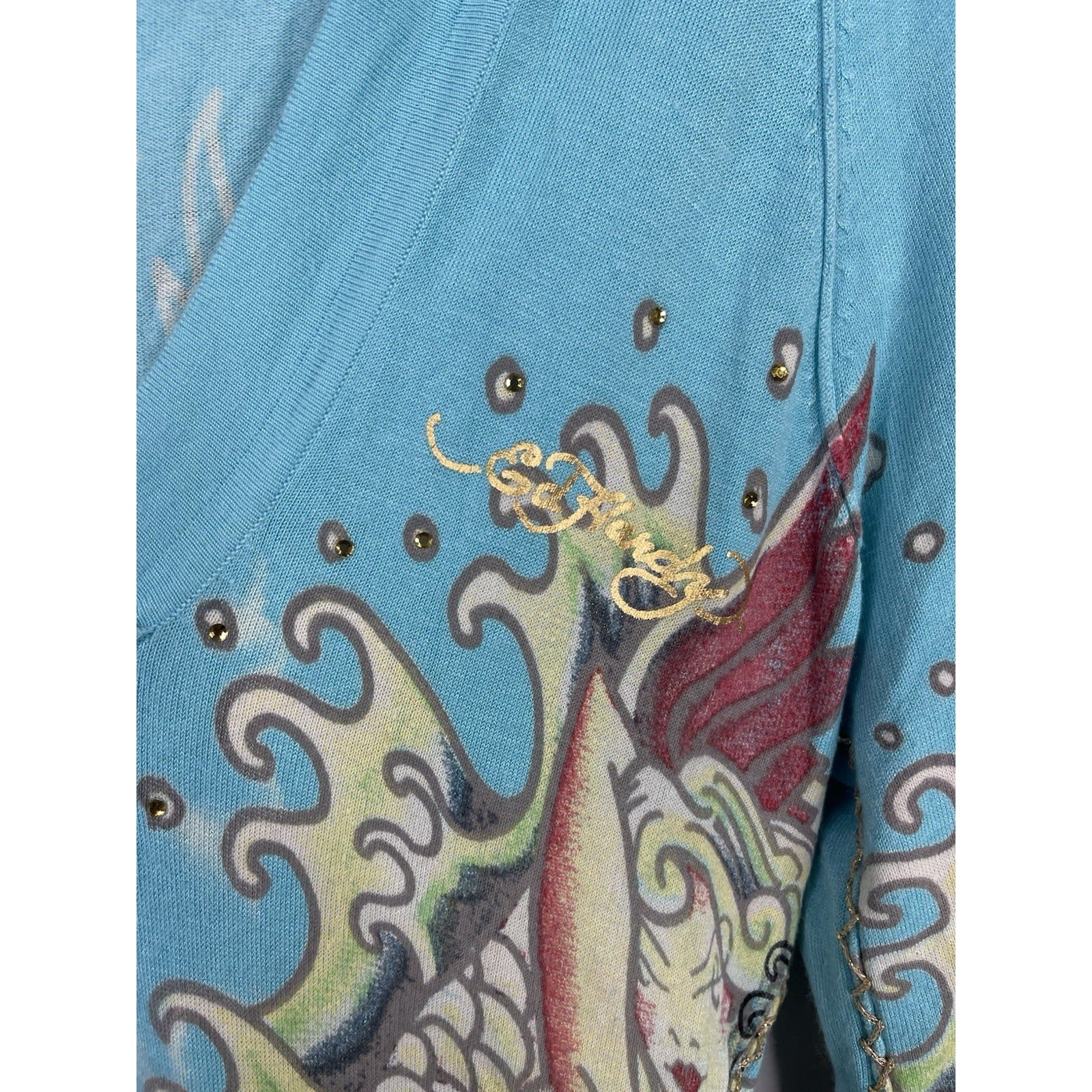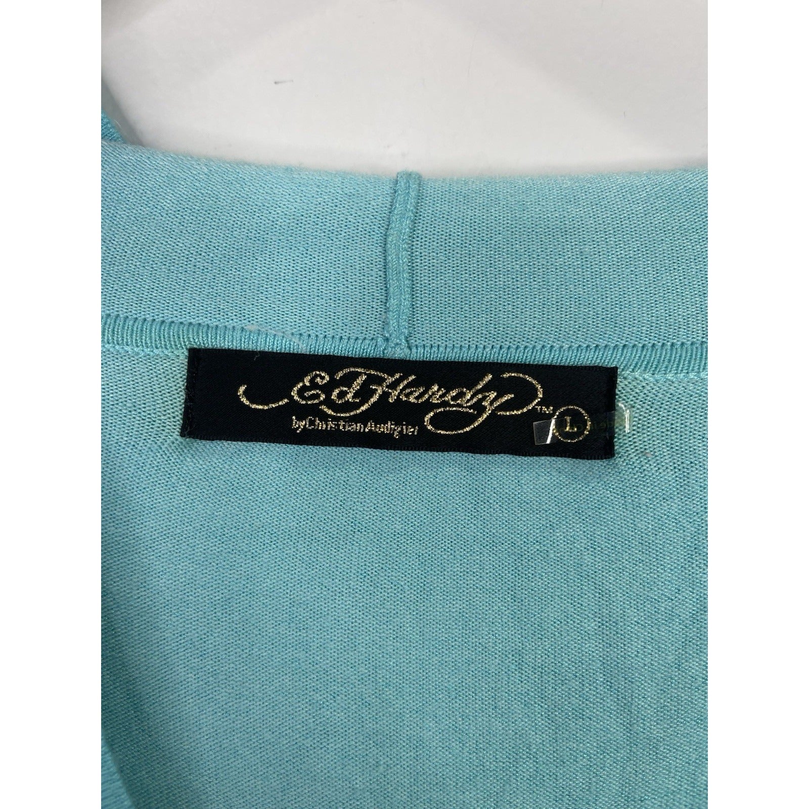 This Women's Y2k Ed Hardy Rhinestones Tattoo Art Knitwear Hoodie in size Large is a vintage piece featuring a striking blue color with rhinestone accents. The long sleeve pullover hoodie is designed for activewear, with a regular fit and a bold art-themed style from the renowned brand Ed Hardy. Perfect for adding a touch of edgy glamour to any wardrobe, this hoodie is a unique statement piece that combines fashion and comfort effortlessly.