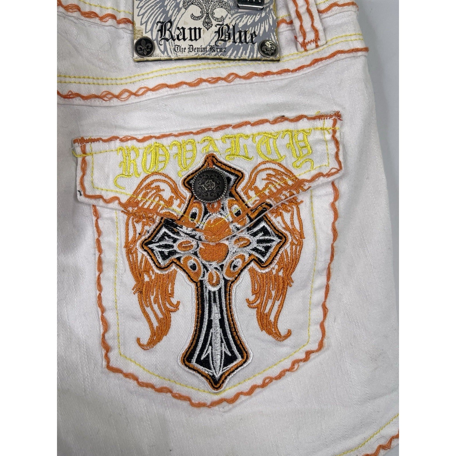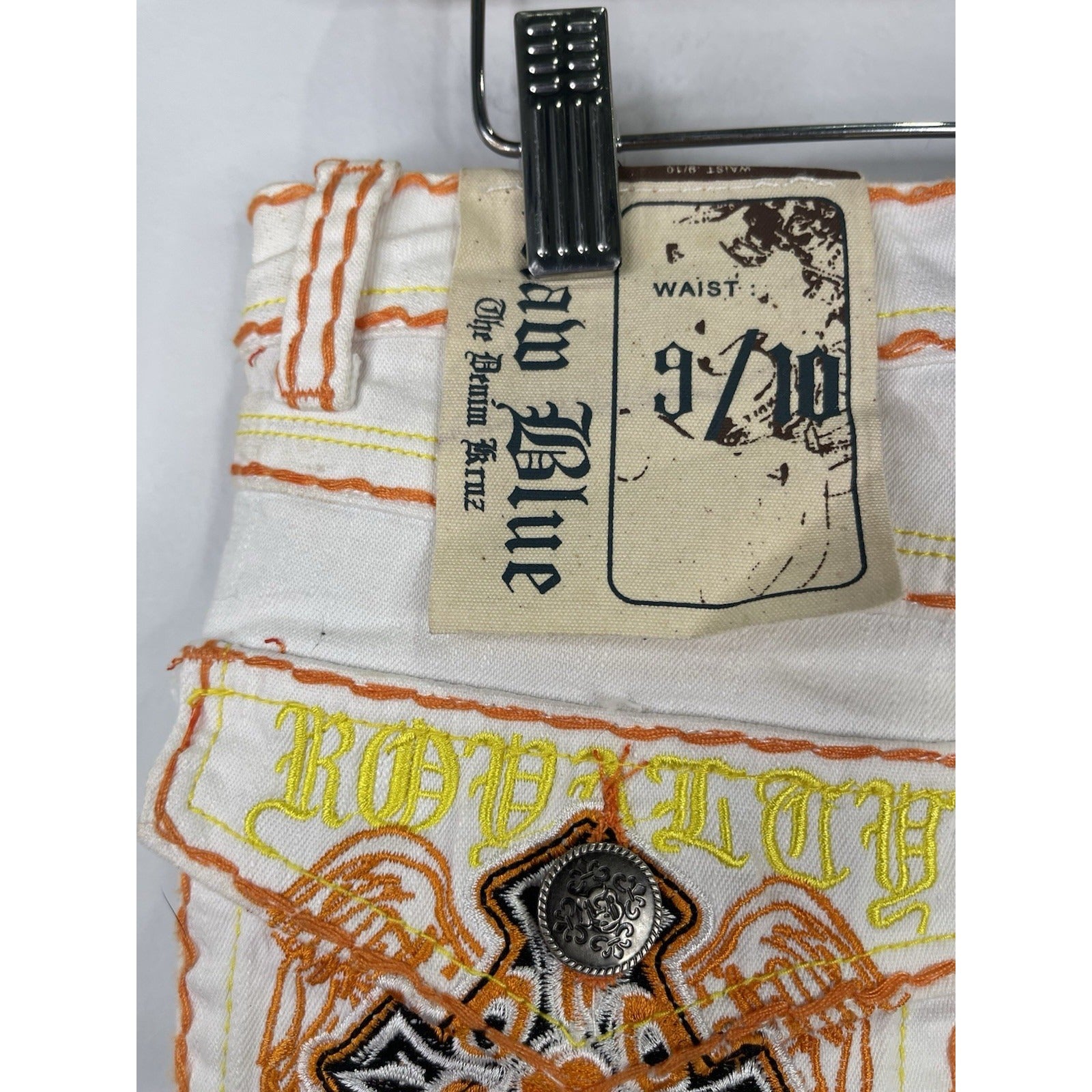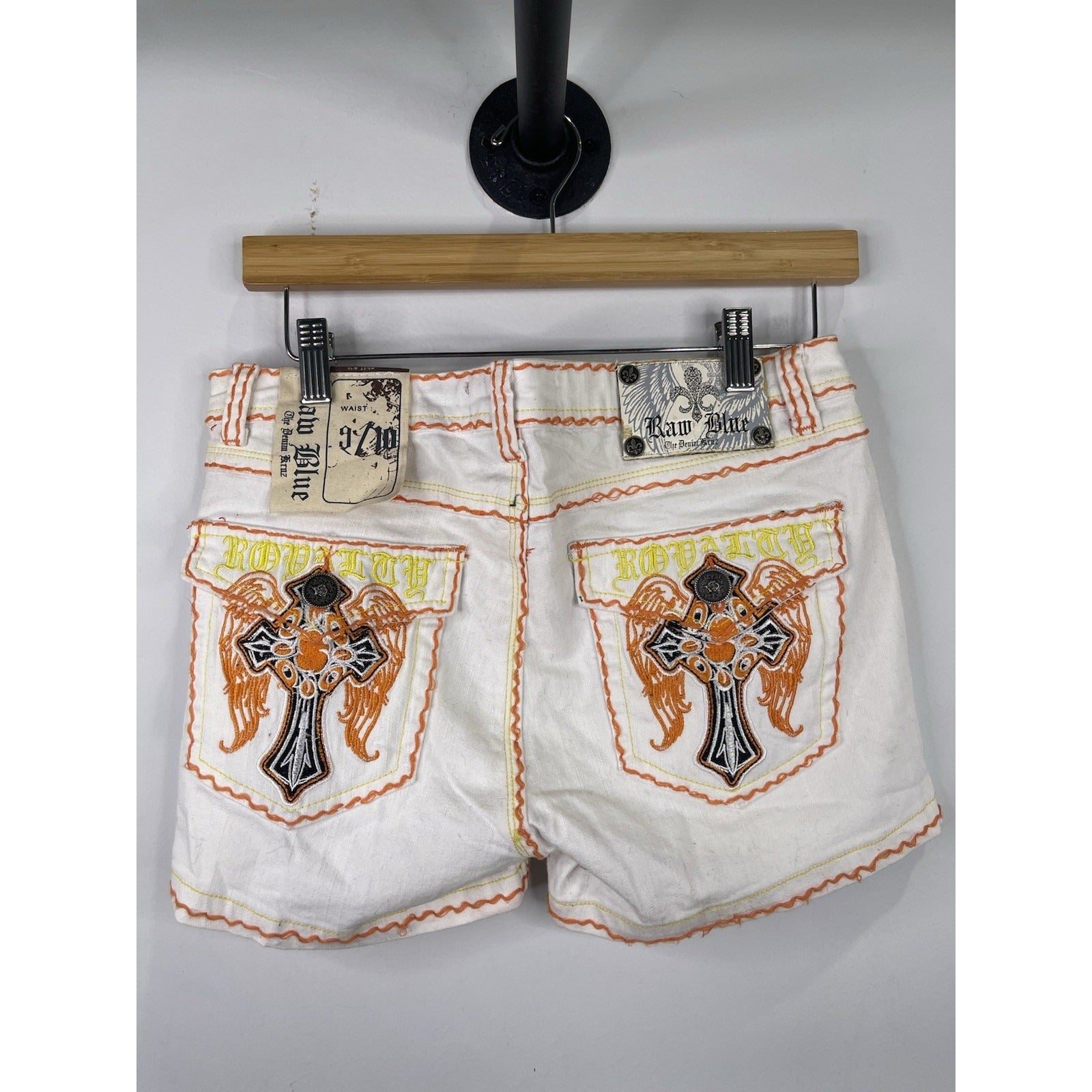 These women's Y2K raw blue white denim jean shorts in size 9/10 are a stylish and unique addition to any wardrobe. With a vintage style and biker theme, these shorts are perfect for casual occasions. Made from cotton denim, they feature a 3-inch inseam and are designed for comfort and durability. The white color adds a touch of contrast to the blue denim, making these shorts stand out from the crowd. Perfect for motorcycle enthusiasts or those looking for a bold and colorful look.