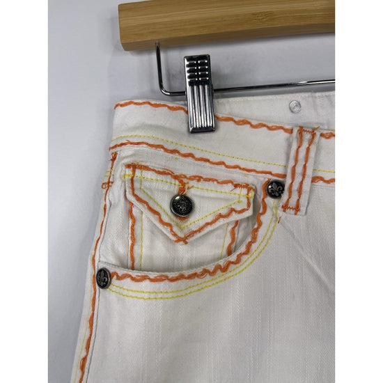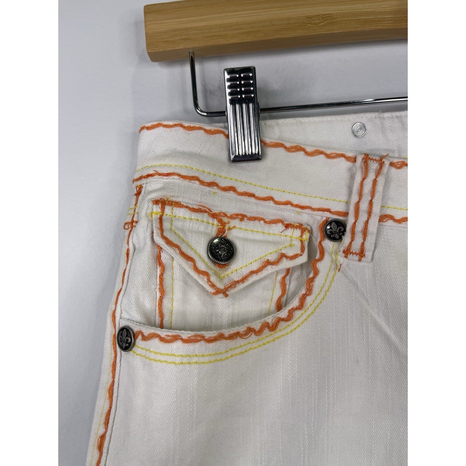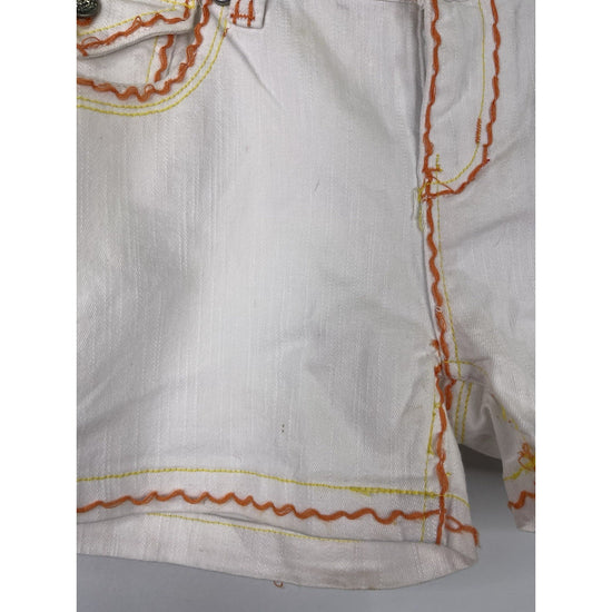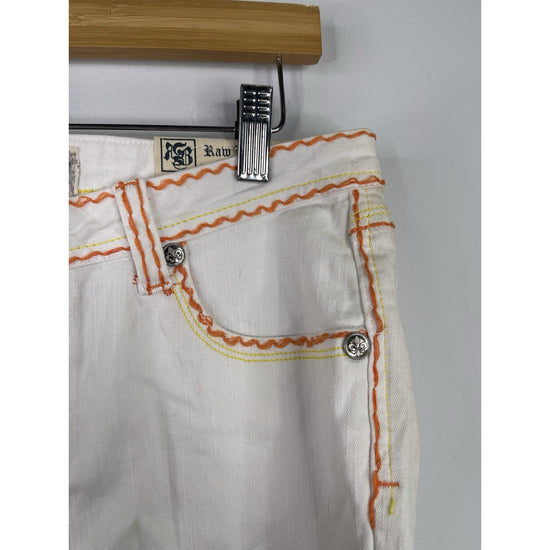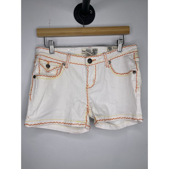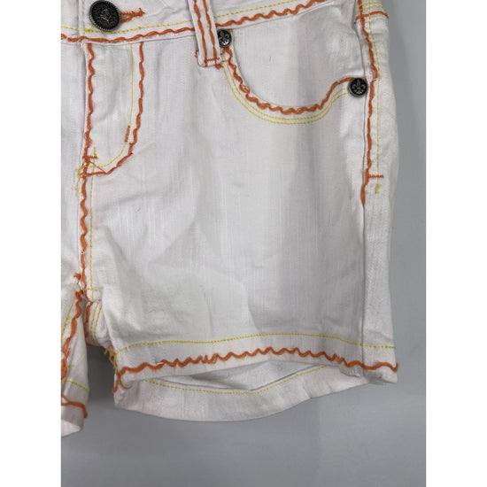 These women's Y2K raw blue white denim jean shorts in size 9/10 are a stylish and unique addition to any wardrobe. With a vintage style and biker theme, these shorts are perfect for casual occasions. Made from cotton denim, they feature a 3-inch inseam and are designed for comfort and durability. The white color adds a touch of contrast to the blue denim, making these shorts stand out from the crowd. Perfect for motorcycle enthusiasts or those looking for a bold and colorful look.