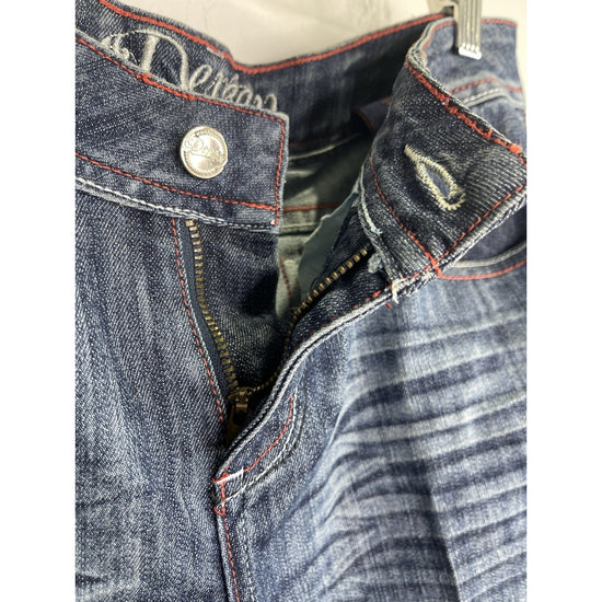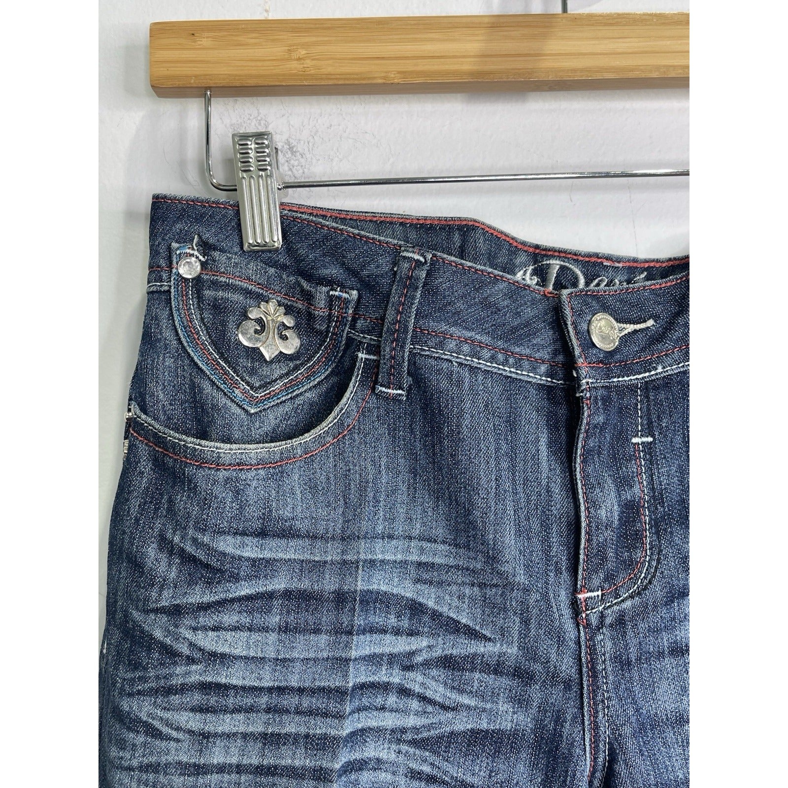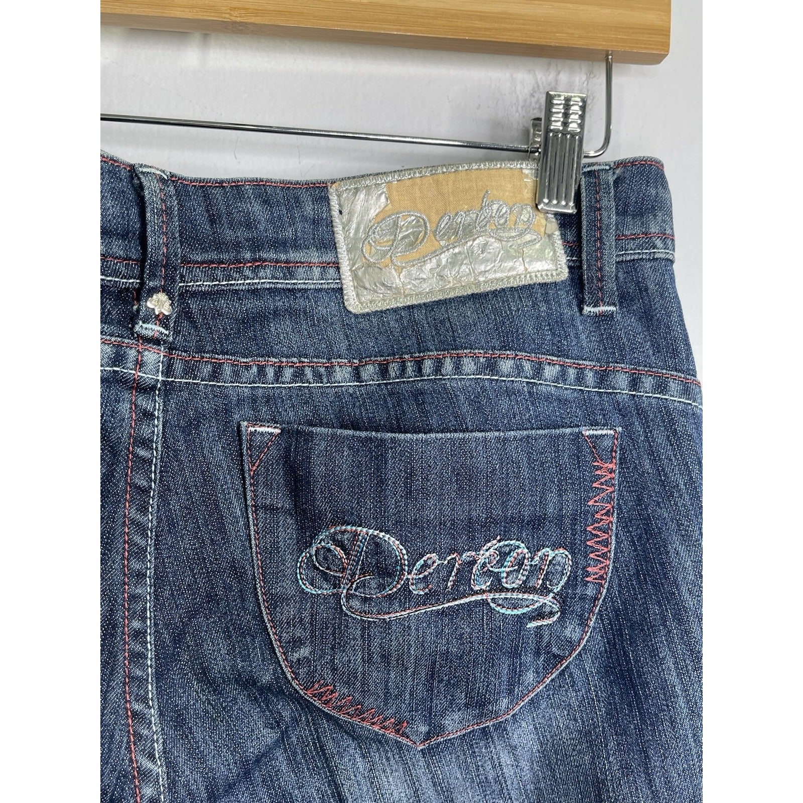 The product is a pair of women's Y2K vintage Dereon bootcut embroidered denim jeans in size 7/8 with a 34-inch inseam. These jeans feature a solid blue color, dark fabric wash, and are made of denim. They have embroidered accents, a regular fit, and come with the brand House of Deréon. The jeans also offer comfort, stretch, and pockets for added convenience. Perfect for those looking for a retro yet stylish addition to their wardrobe.