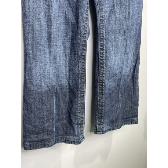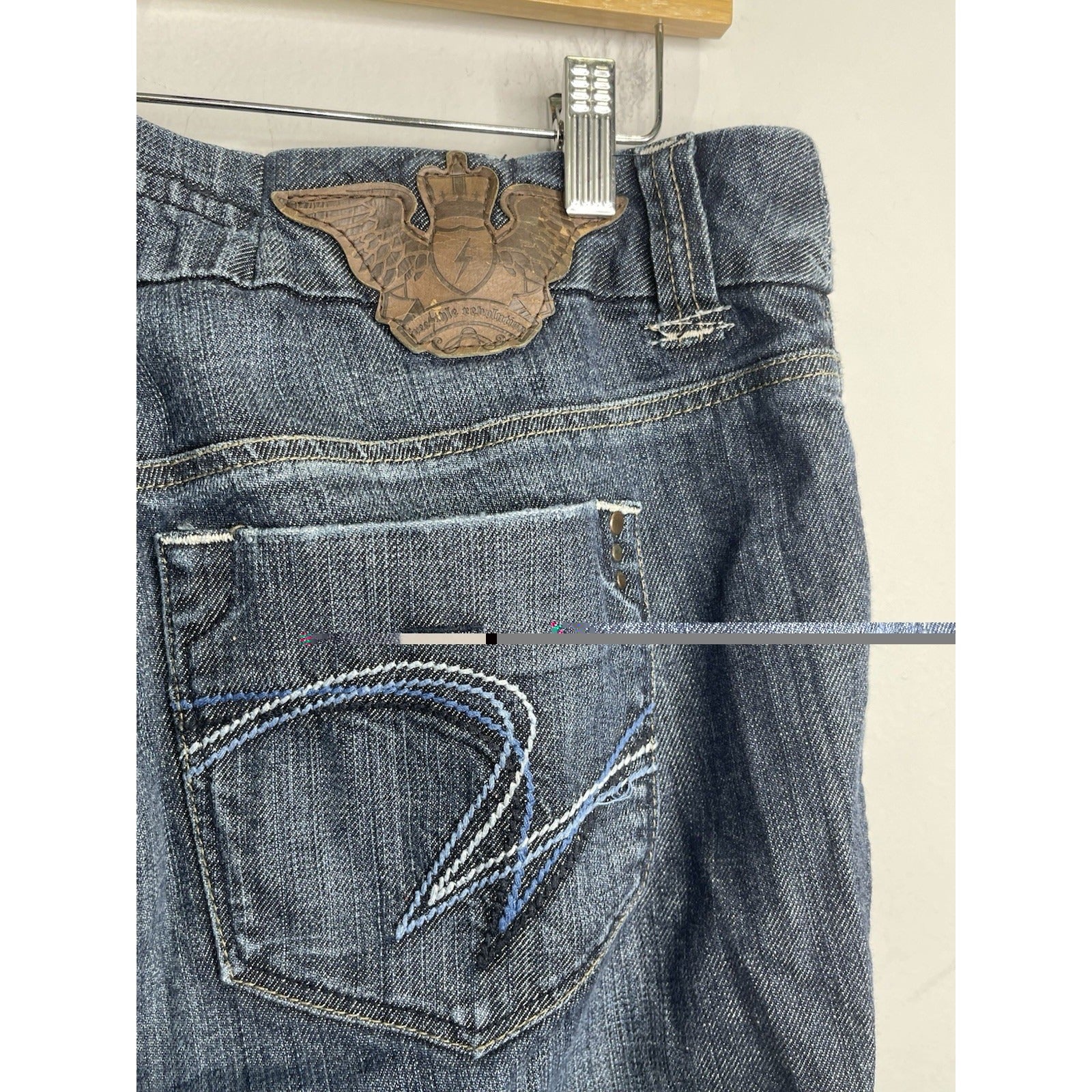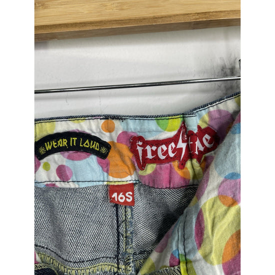The product is a pair of Women's Y2K VTG Wear It Loud Freestyle Revolutionary Denim Straight Jeans in size 16. These jeans feature a solid blue color with a medium wash, made of cotton denim fabric. They have a classic fit with a zip and button closure, featuring a straight style and a 27-inch inseam. The brand is Freestyle Revolution, designed for women and in a regular size type.