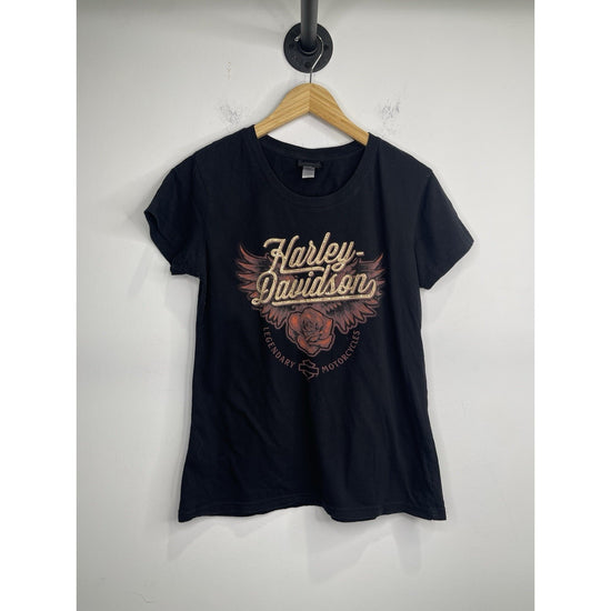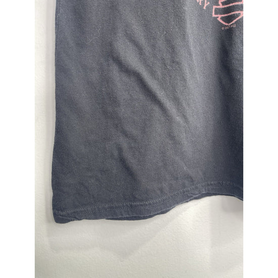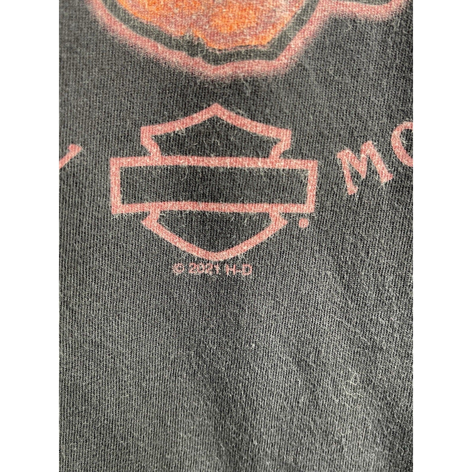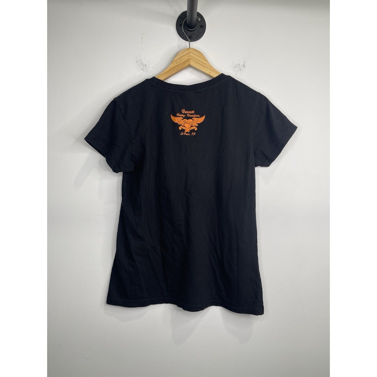 The Women's Black Y2K 2021 Harley Davidson Short Sleeve T-Shirt in size L is a stylish and comfortable top featuring a solid black color with rhinestone accents for a touch of flair. Made from cotton, this classic fitted sleeve t-shirt has a round neckline and is adorned with the iconic Harley-Davidson brand logo, making it a fashionable and trendy addition to any wardrobe. Perfect for casual wear, this basic t-shirt is a versatile piece that can be dressed up or down for any occasion.