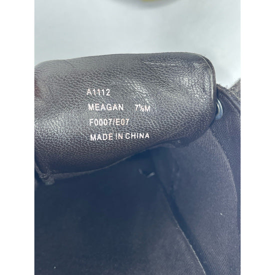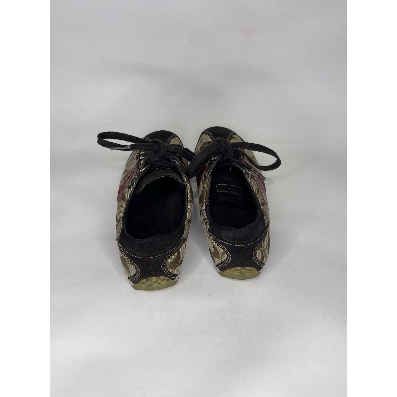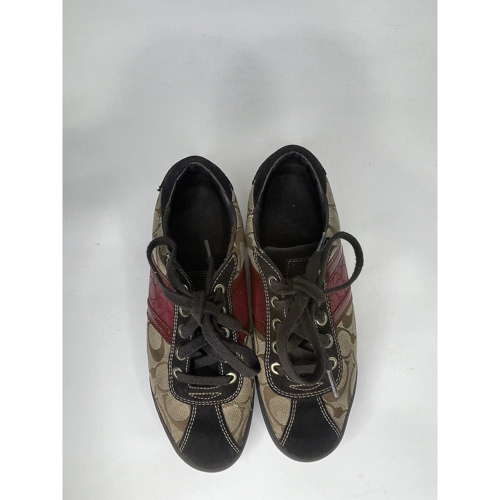 The product is a pair of women's Coach Meagan brown leather suede signature print athletic shoes in size 7 1/2. These lace-up sneakers are designed for tennis and walking, featuring a combination of suede and canvas upper material with a fabric outsole. The signature Coach print adds a touch of style to these versatile athletic shoes, making them a fashionable and functional choice for active women.