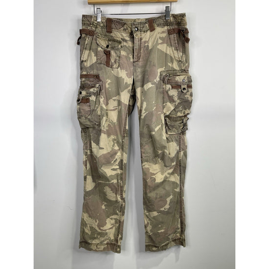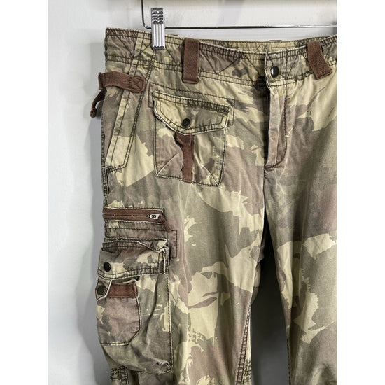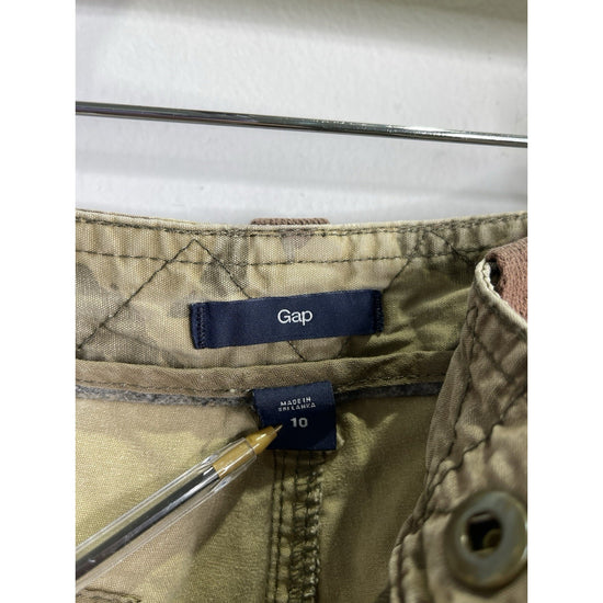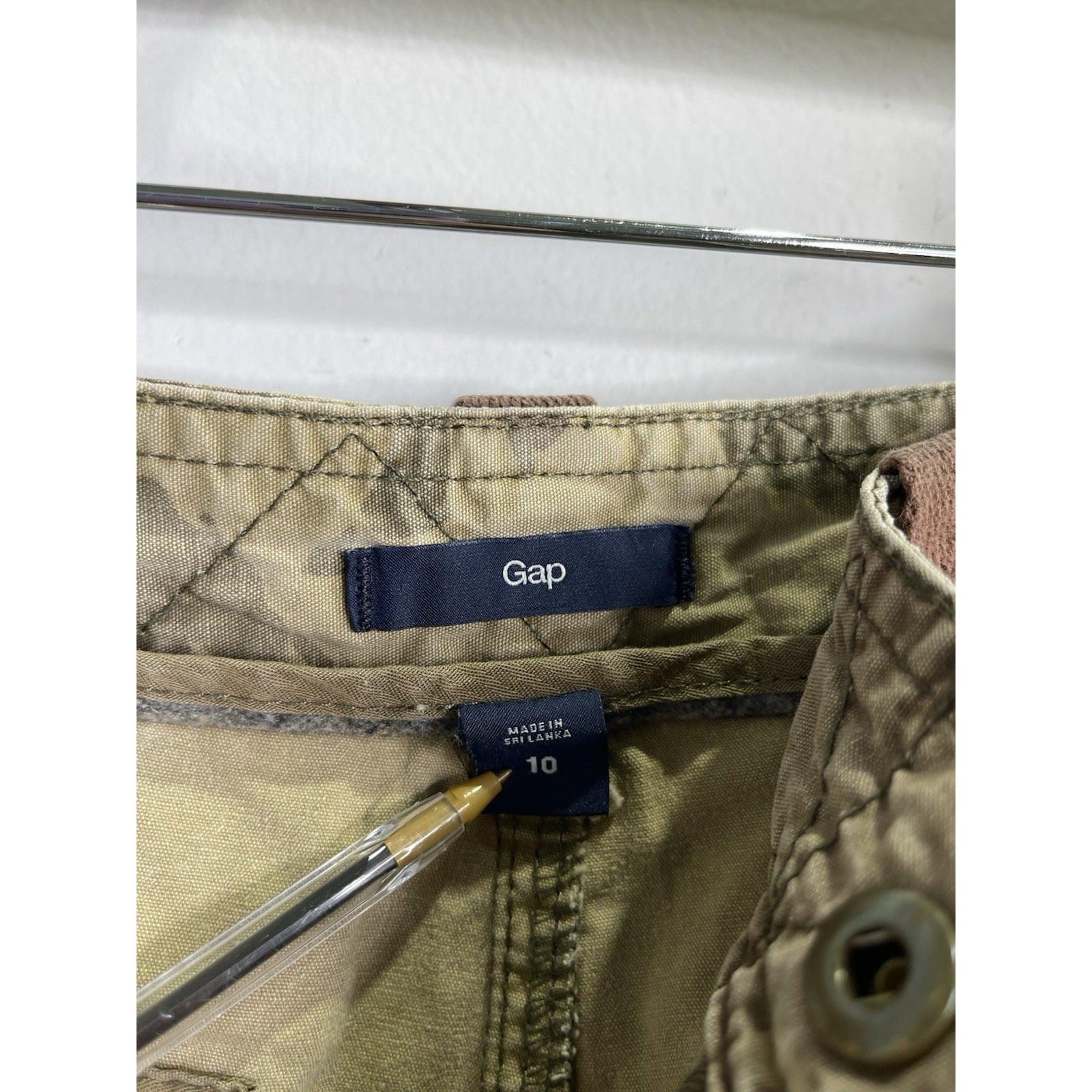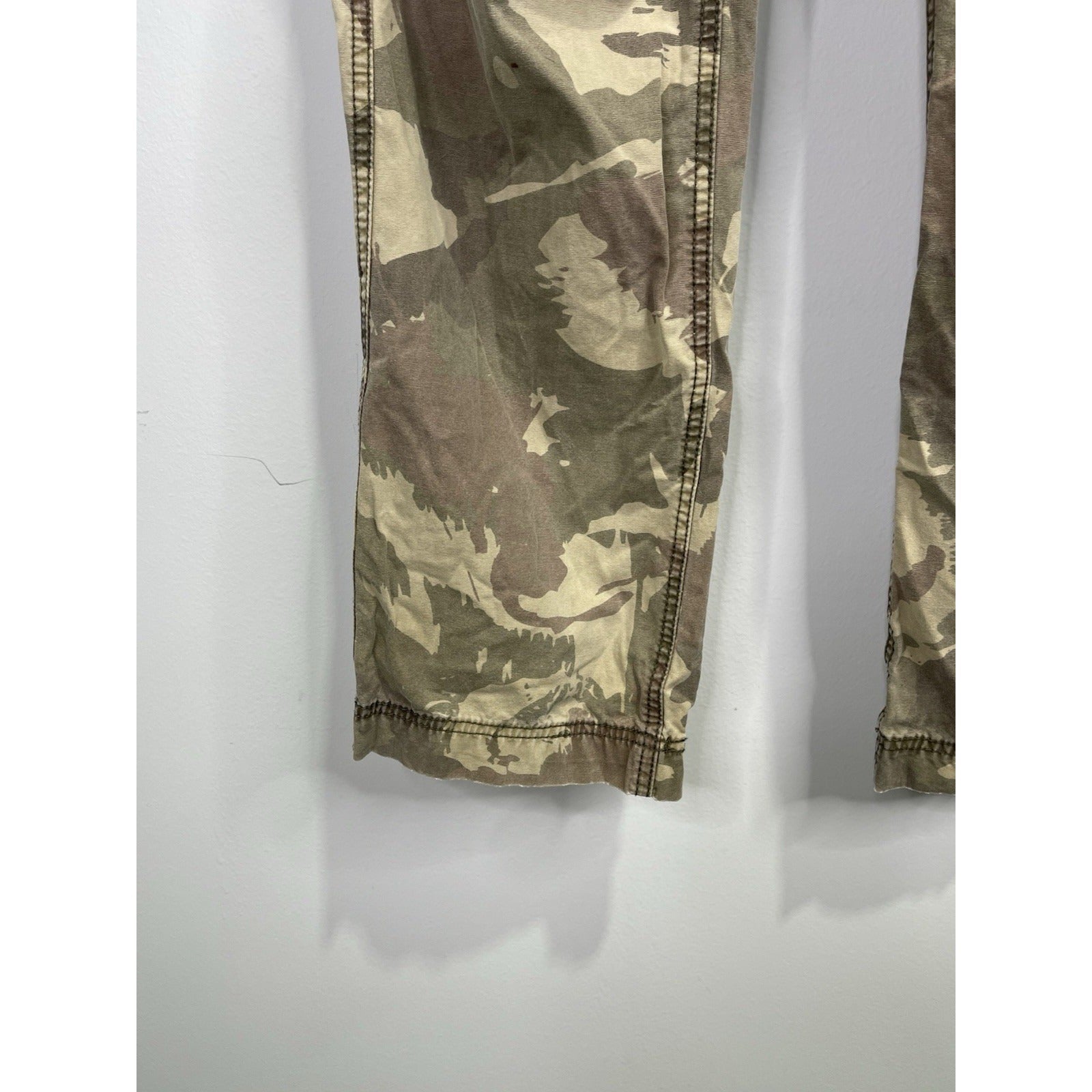These vintage Y2K Gap cargo pants for women in size 10 feature a camouflage pattern, zip closure, and straight leg style. Made of cotton, these loose paratrooper military utility pants are perfect for casual occasions with their multicolor design and army, Y2K, and grunge themes. With an adjustable waist and pockets for convenience, these pants offer both comfort and style for a unique and trendy look.