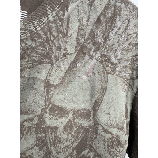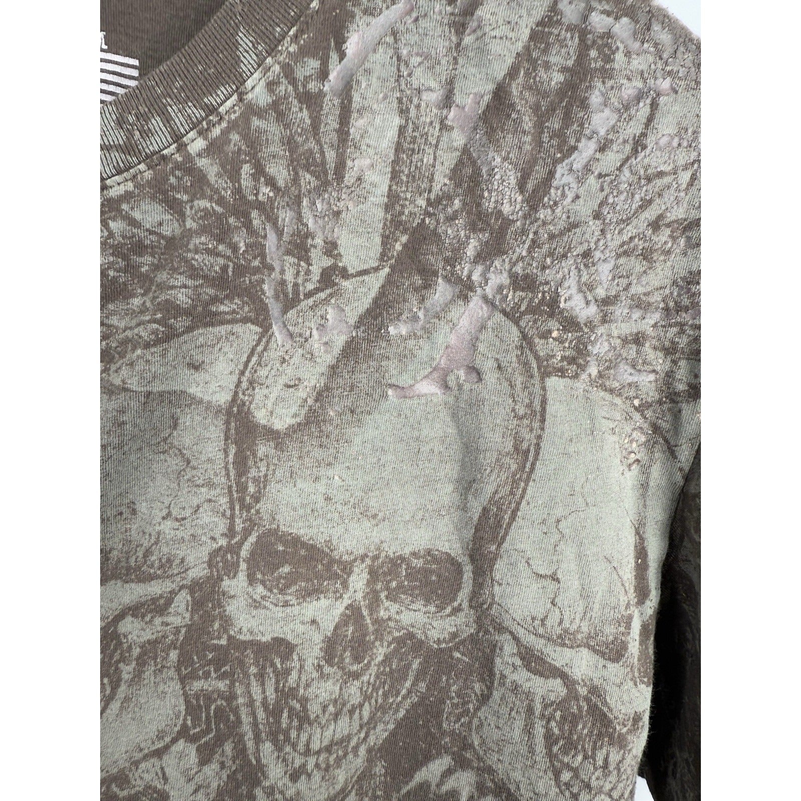 The product is a men's Y2k era Xtreme Couture t-shirt, sized M. It features a regular fit, short sleeves, and is designed in a brown color with a grunge and skull theme. Perfect for those looking for a vintage style shirt from the early 2000s, this t-shirt embodies the edgy and unique fashion trends of that era. Ideal for fans of Xtreme Couture or those who appreciate a nostalgic look with a modern twist.