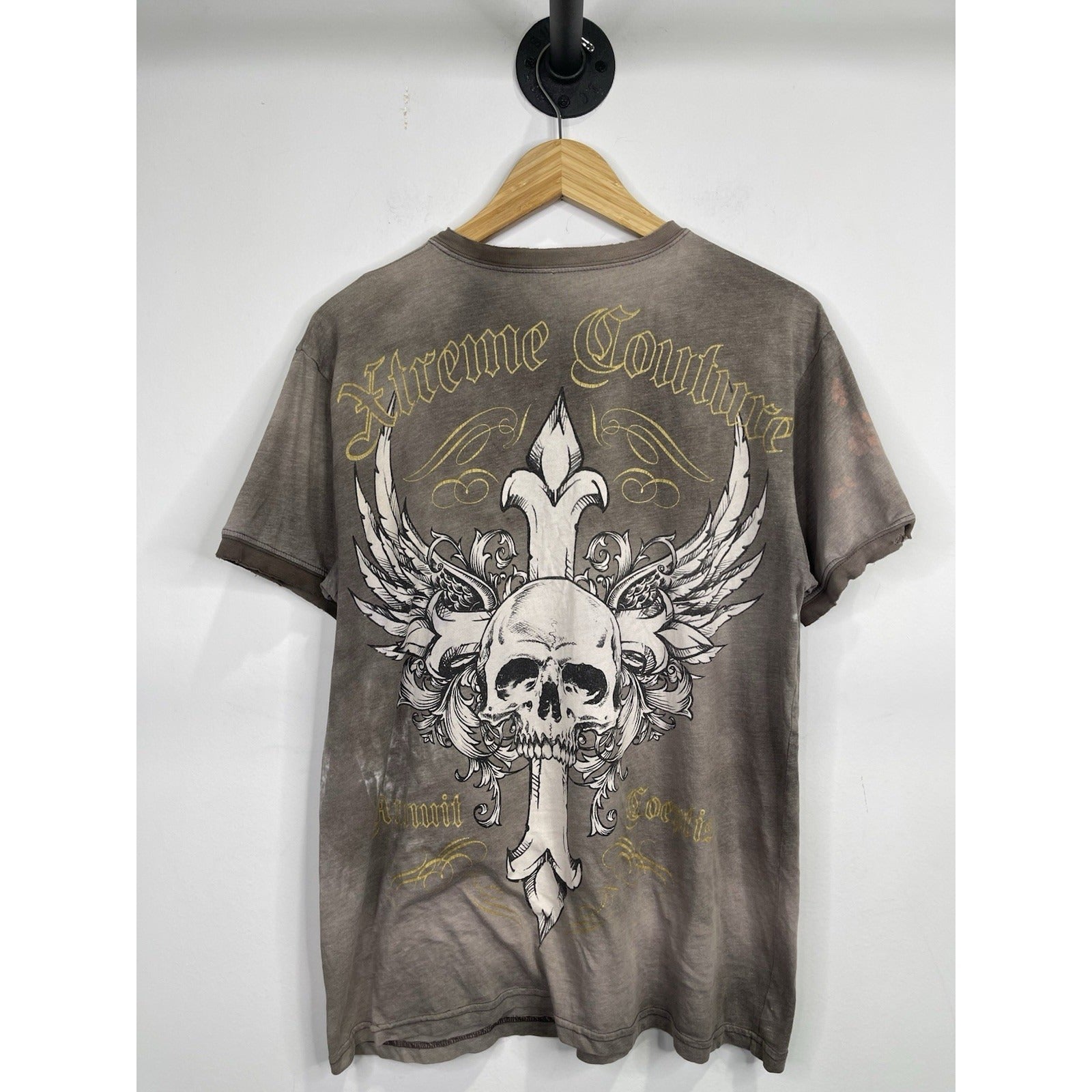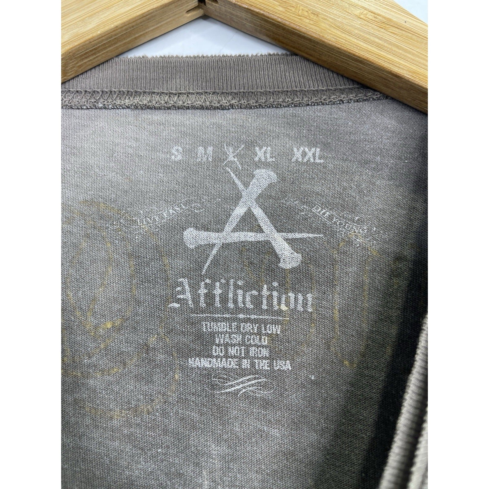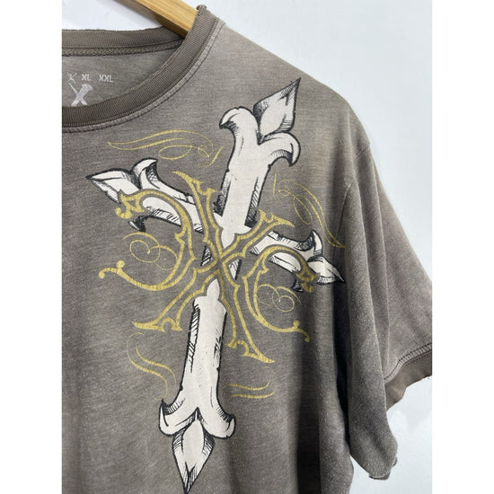 The product is a vintage Affliction style Y2K cross grunge t-shirt in size large. Made of cotton in a gray color, this shirt features a crew neck and short sleeves, offering a regular fit. With a grunge theme and all-season versatility, this United States-made t-shirt is perfect for men looking to add a touch of edgy style to their wardrobe.