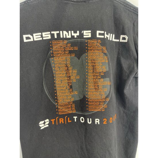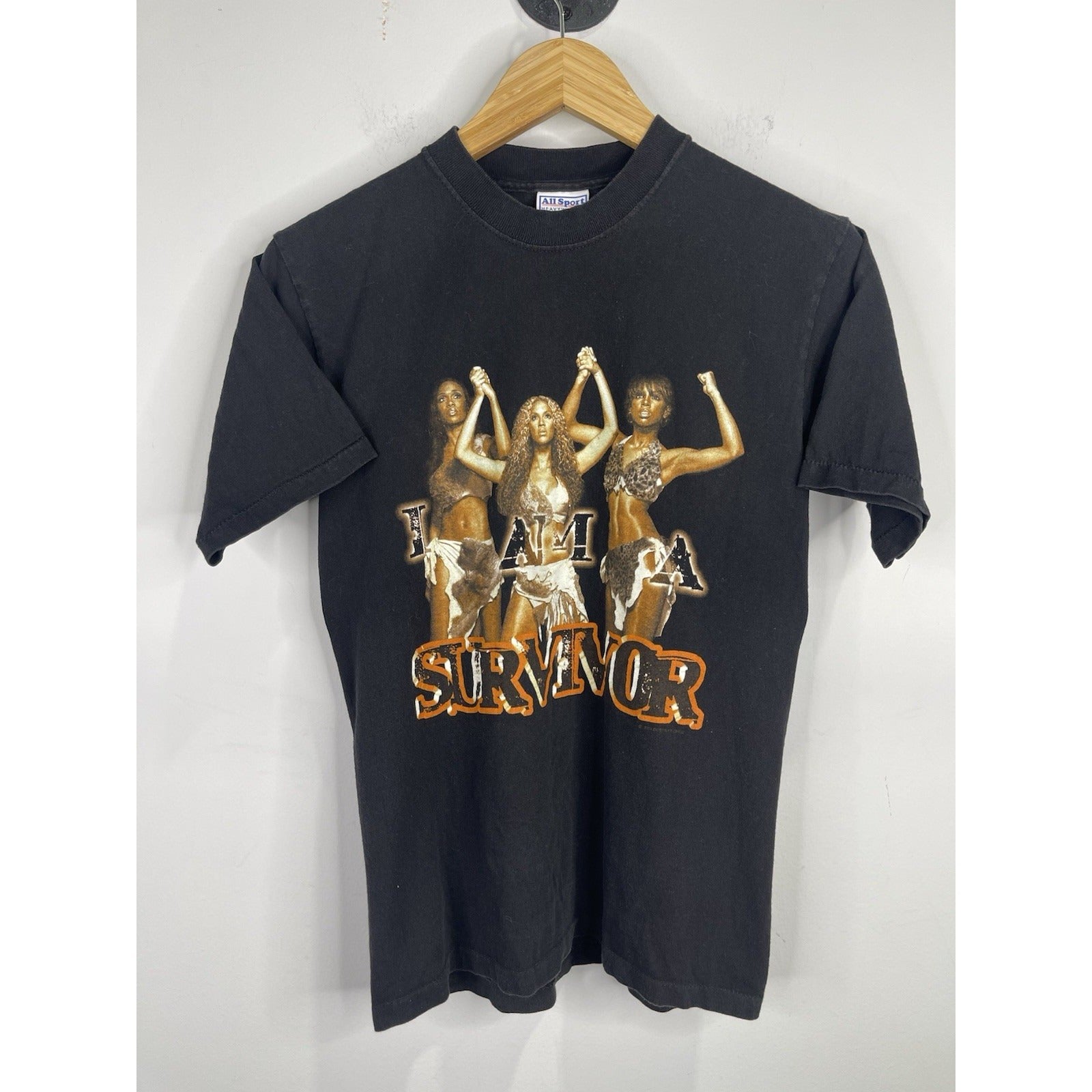 This Y2K Destiny's Child TRL TOUR 2001 T-shirt features a graphic print design with the iconic slogan "I Am A Survivor" by Beyonce. Made of breathable cotton material with a regular fit, this black shirt has a crew neckline and short sleeves, making it suitable for all seasons. The shirt is double-sided and perfect for fans of the band or those who appreciate 90s nostalgia. Made in Mexico by All Sport, this t-shirt in size S is a stylish and comfortable addition to any music lover's wardrobe.