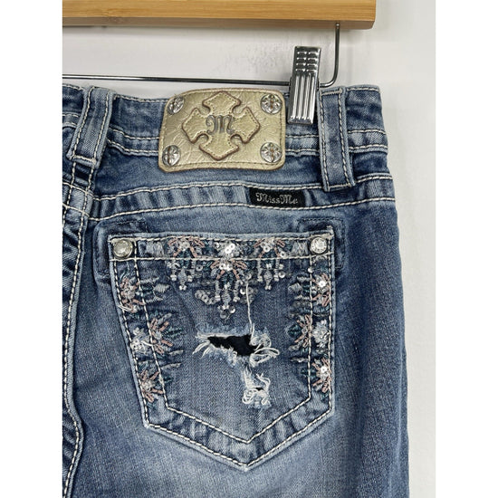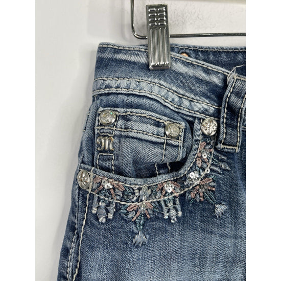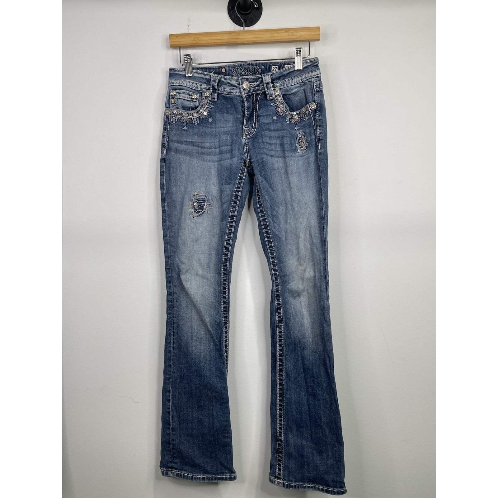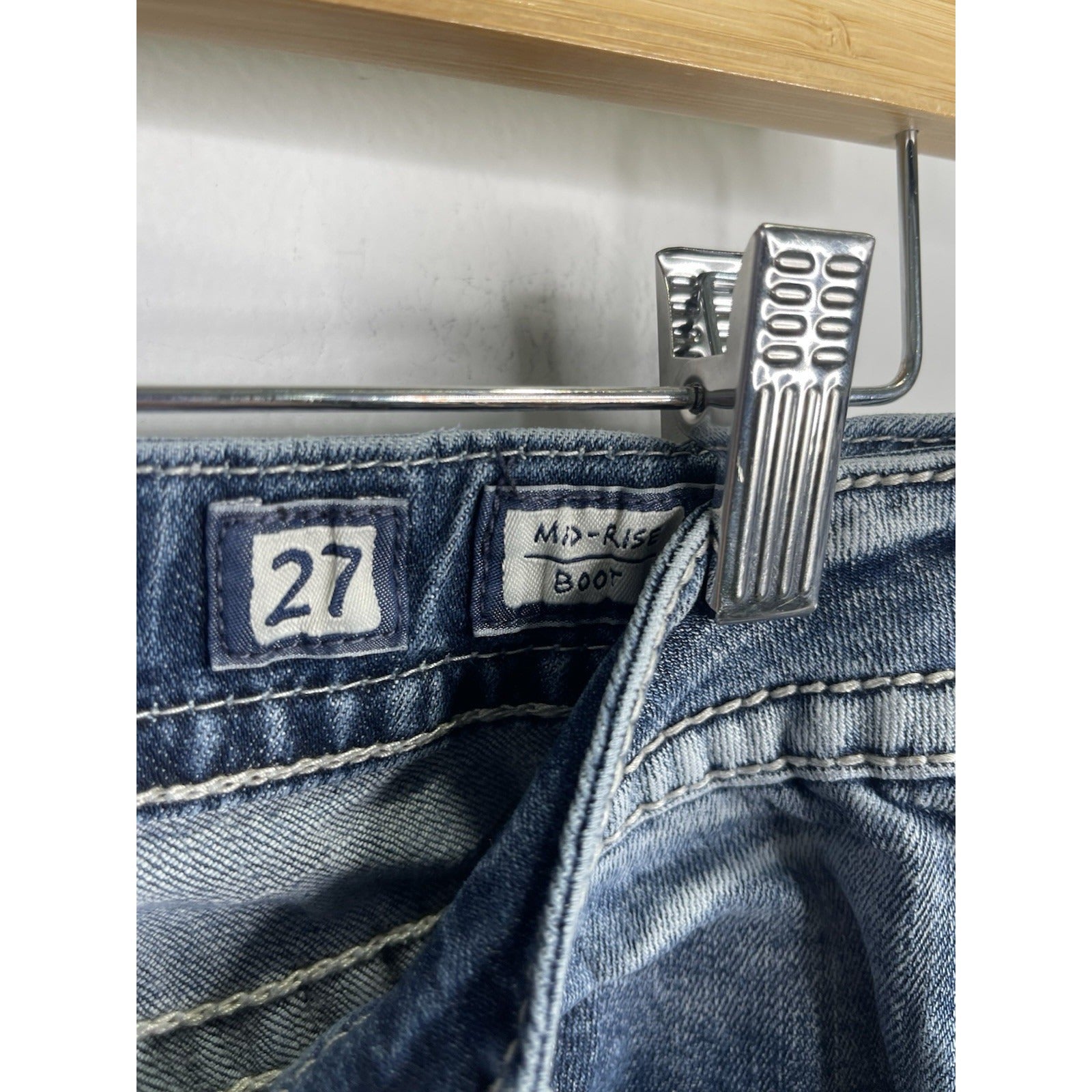 The Y2k Women's Miss Me Blue Size 27 Mid-rise Boot Cut Jeans are a stylish and versatile addition to any wardrobe. Made from cotton denim with a medium wash, these vintage-inspired jeans feature a solid blue color with rhinestone accents for a touch of flair. The high-rise waist and regular fit offer a comfortable and flattering silhouette, while the bootcut style adds a touch of flair to the lower leg. With a classic zip and button closure and convenient pockets, these jeans are perfect for everyday wear or dressed up for a night out.