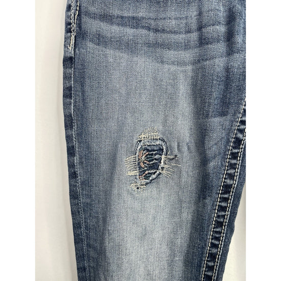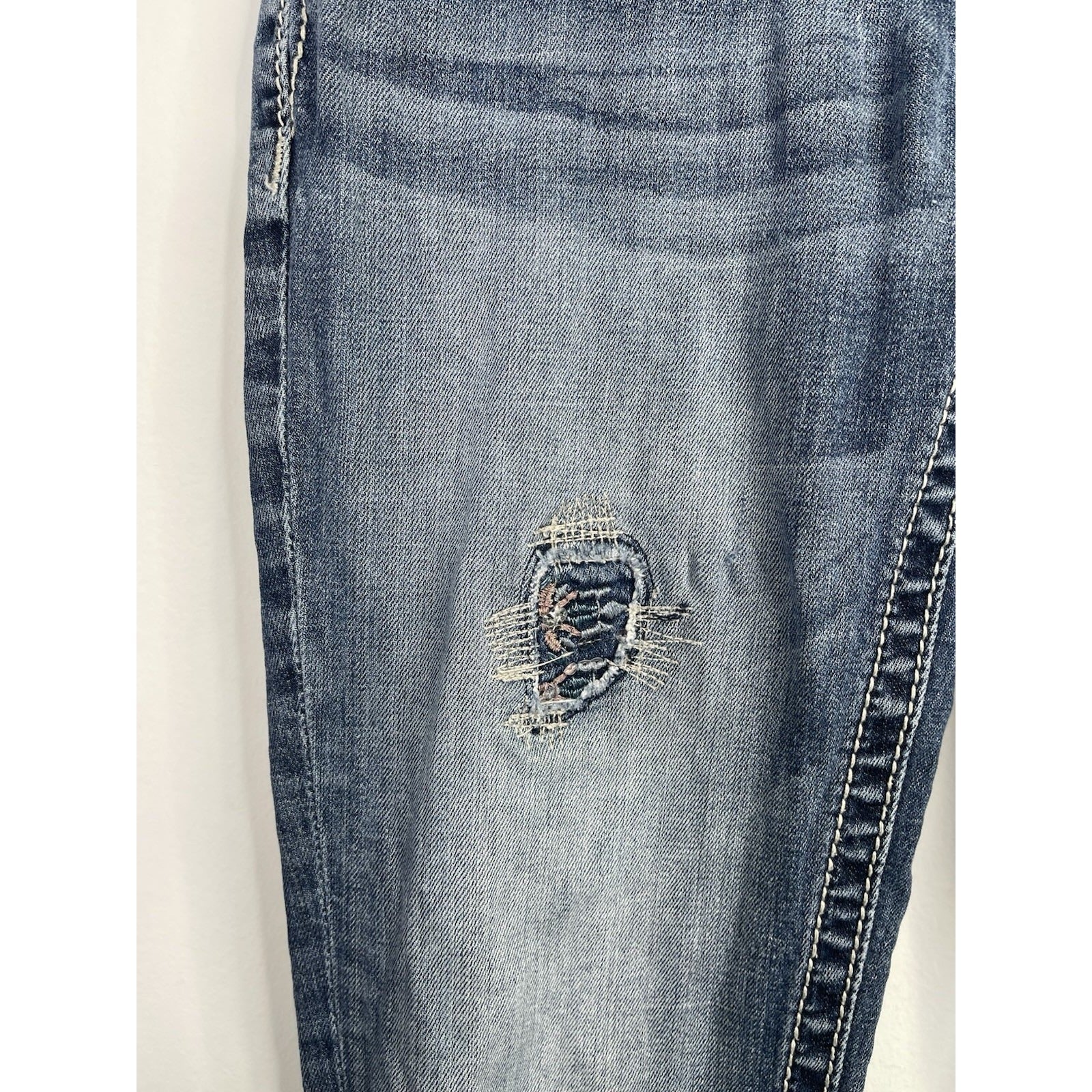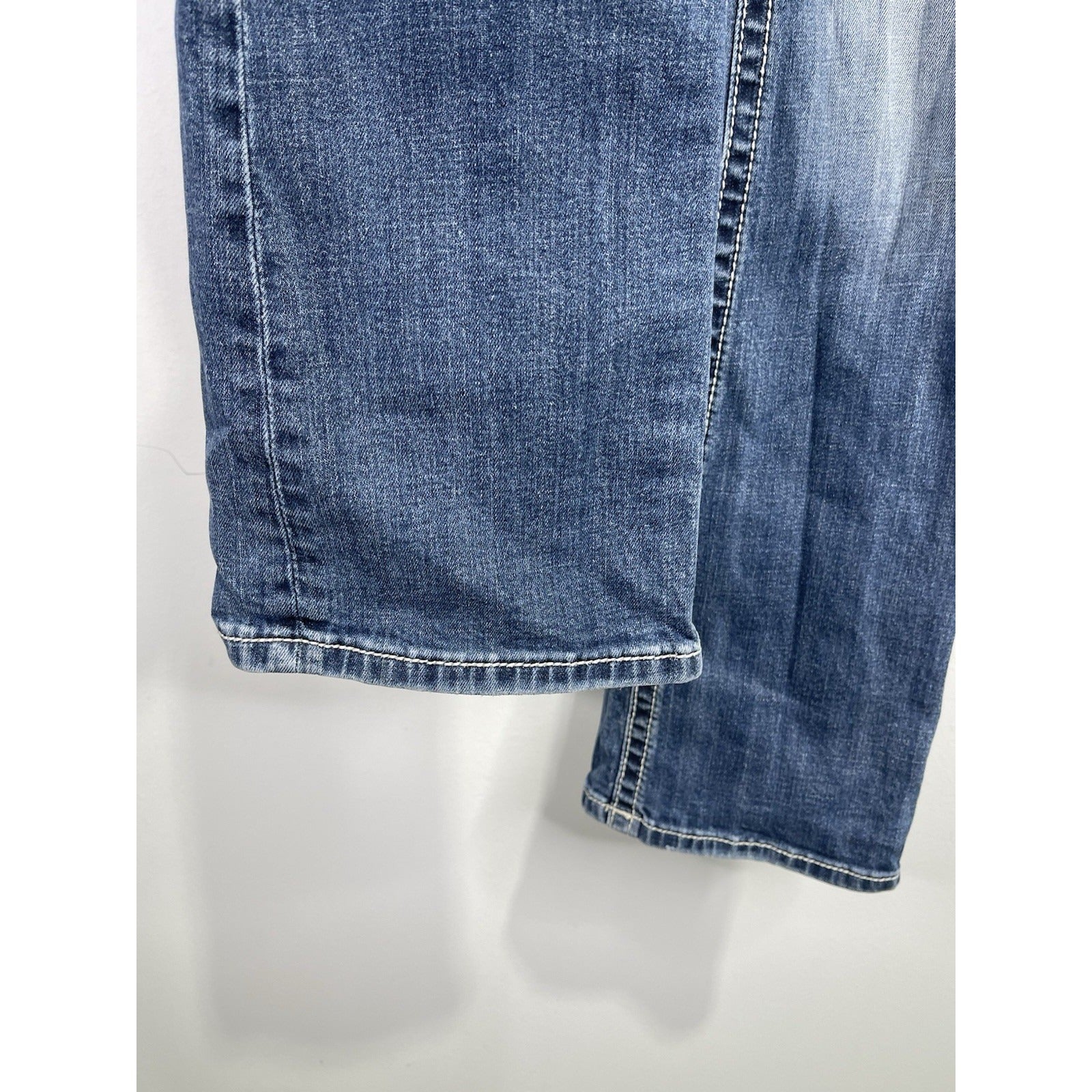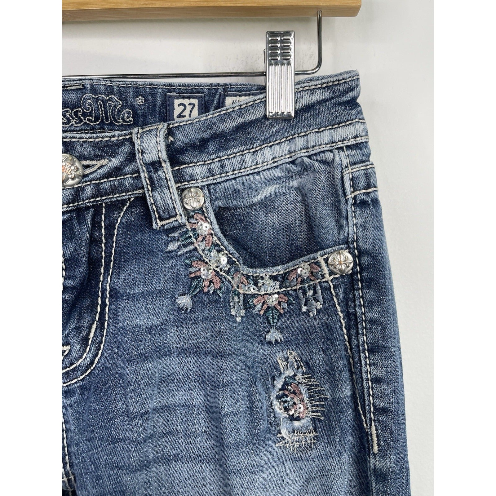 The Y2k Women's Miss Me Blue Size 27 Mid-rise Boot Cut Jeans are a stylish and versatile addition to any wardrobe. Made from cotton denim with a medium wash, these vintage-inspired jeans feature a solid blue color with rhinestone accents for a touch of flair. The high-rise waist and regular fit offer a comfortable and flattering silhouette, while the bootcut style adds a touch of flair to the lower leg. With a classic zip and button closure and convenient pockets, these jeans are perfect for everyday wear or dressed up for a night out.