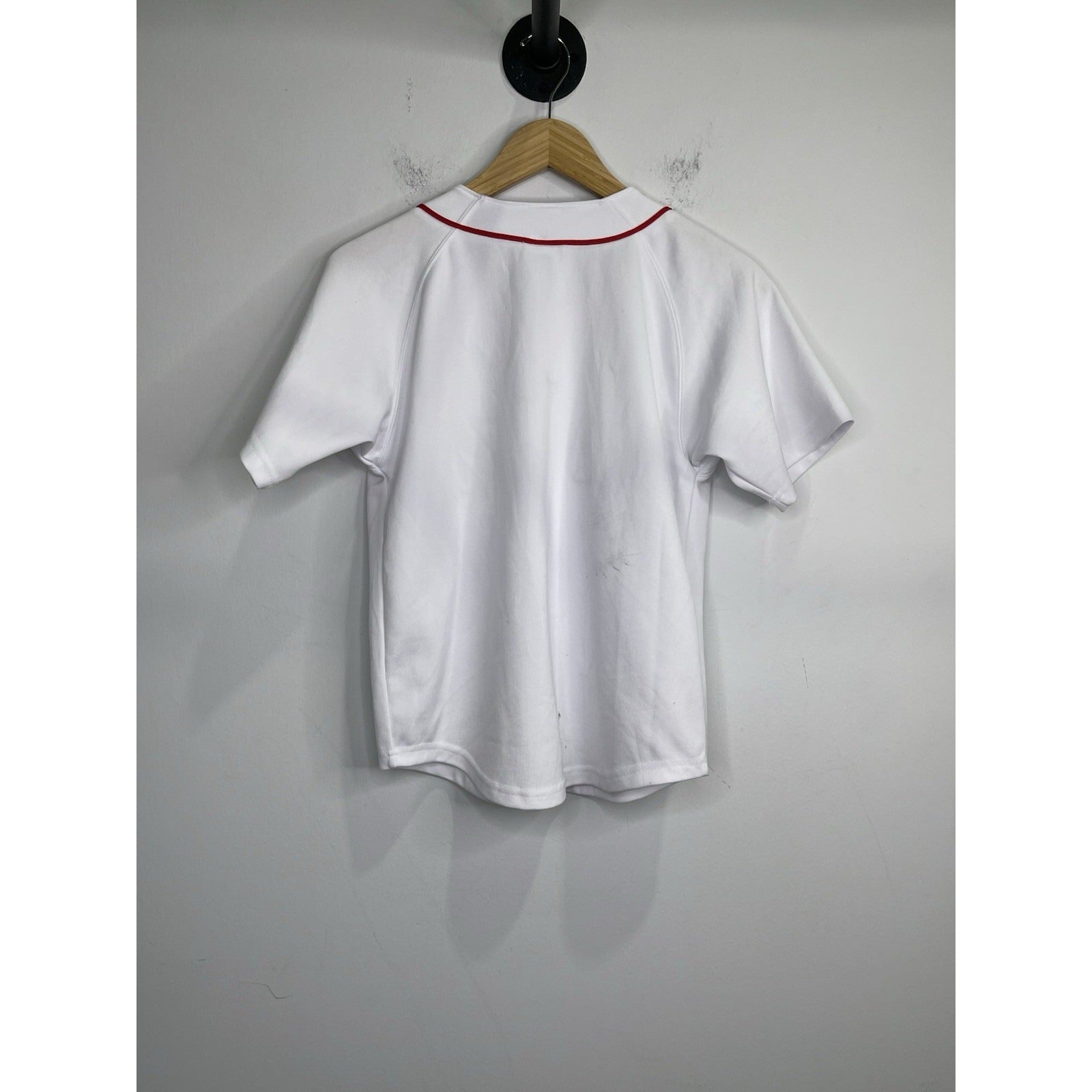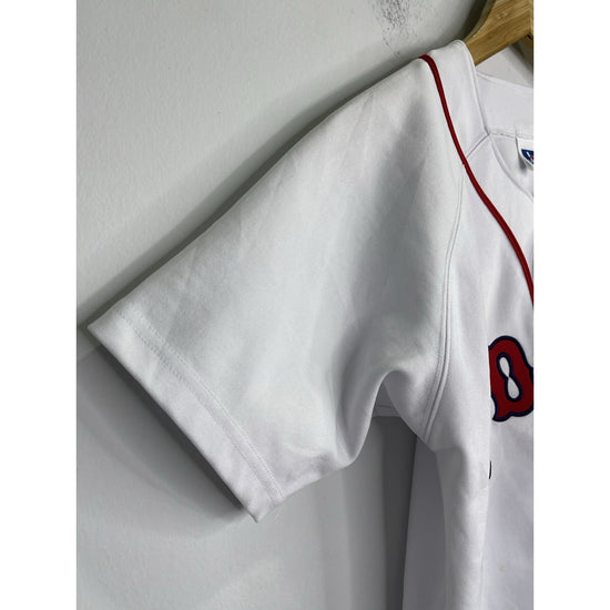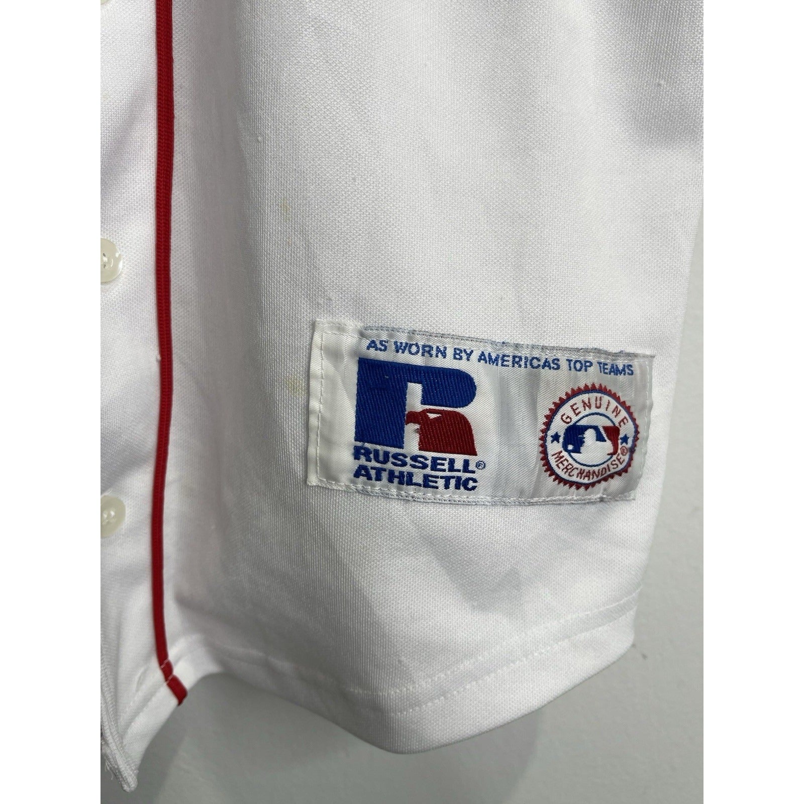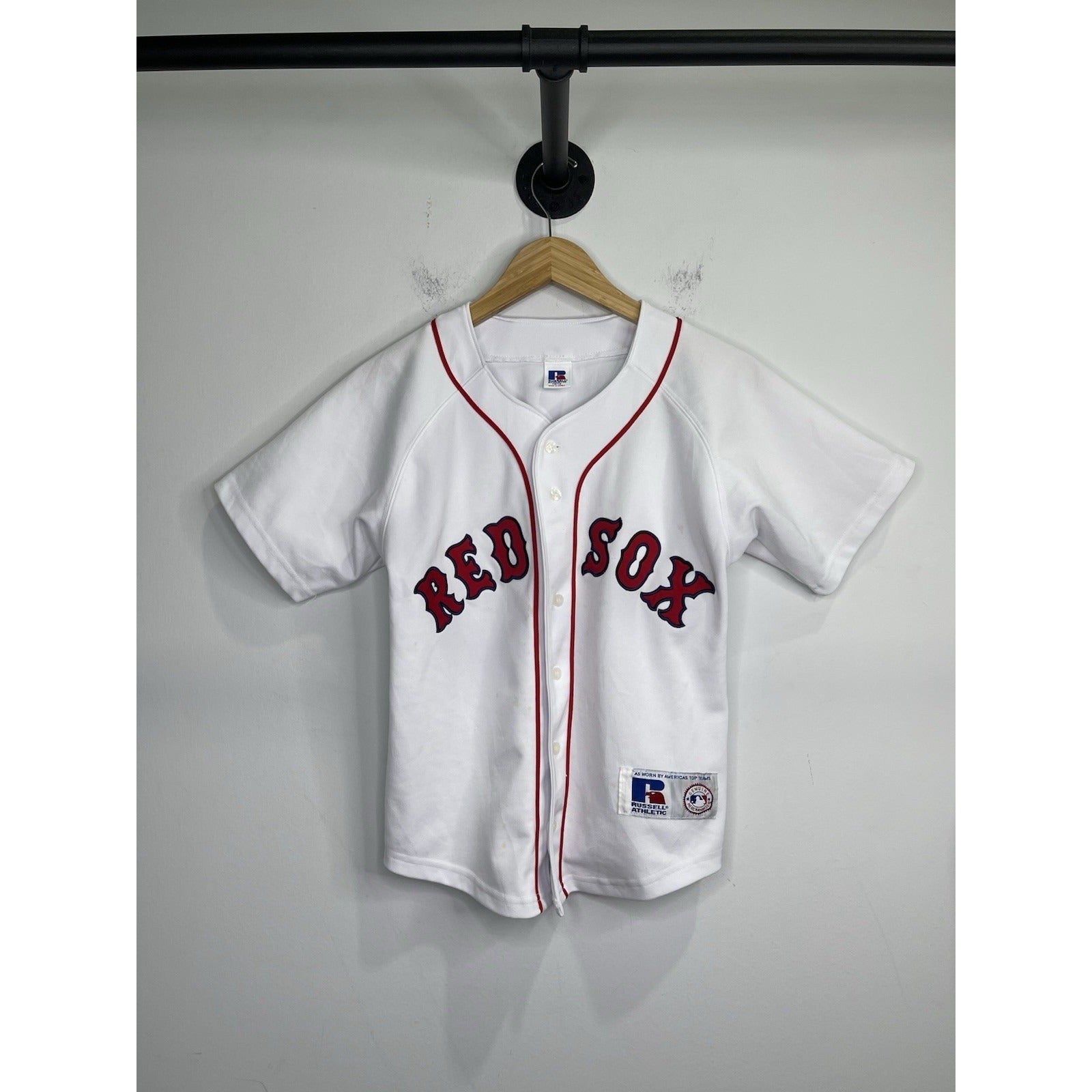 The product is a Russell Athletic Boston Red Sox button-up jersey in size XL, officially licensed by Major League Baseball. Made for men, the jersey features the classic white color and is perfect for showing support for the team during the regular season. Whether for a game or casual wear, this jersey is a must-have for any Red Sox fan looking to represent their favorite team in style.