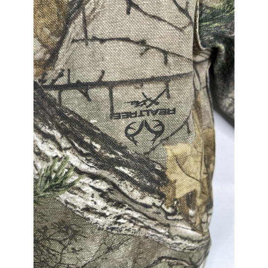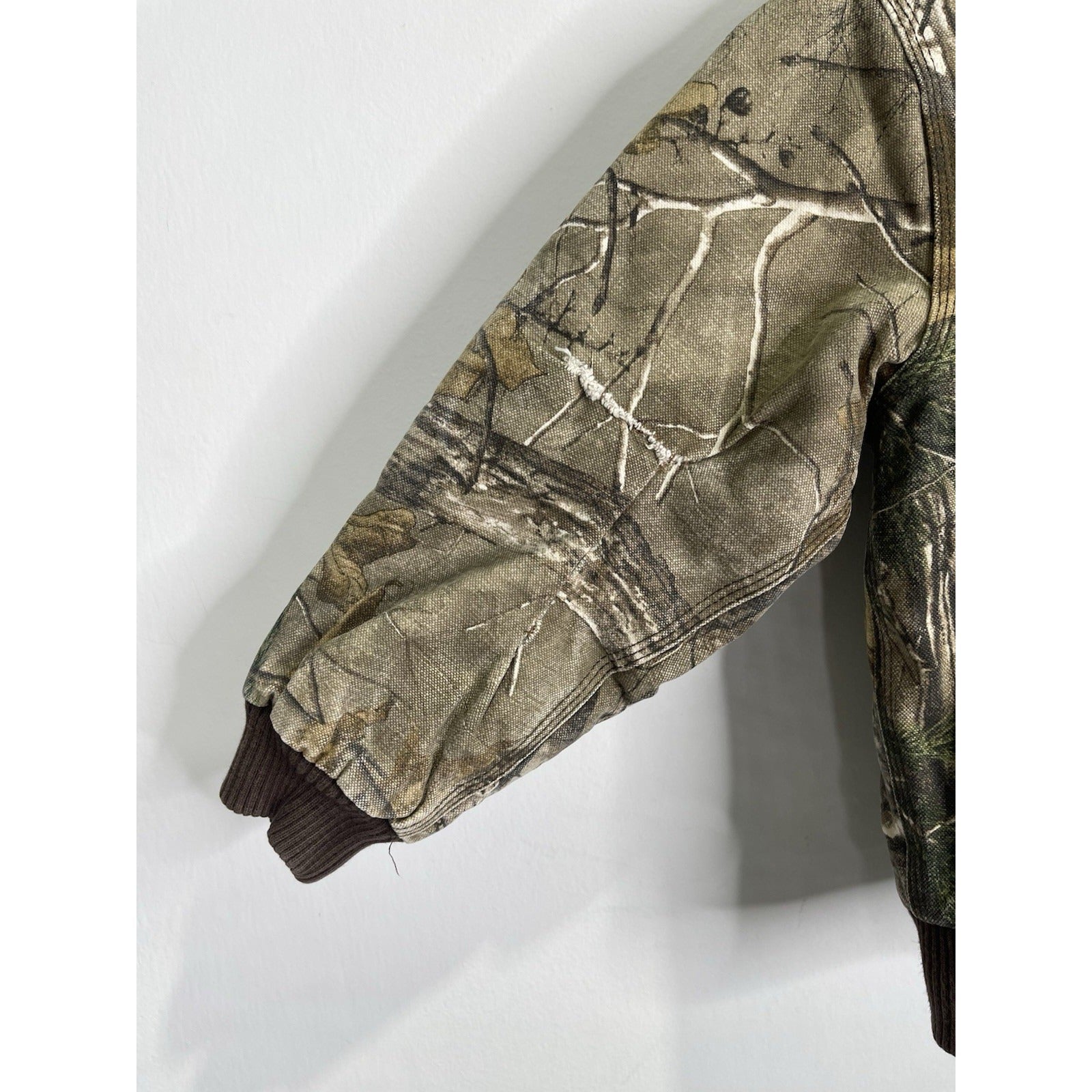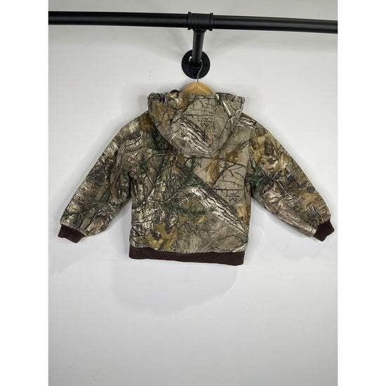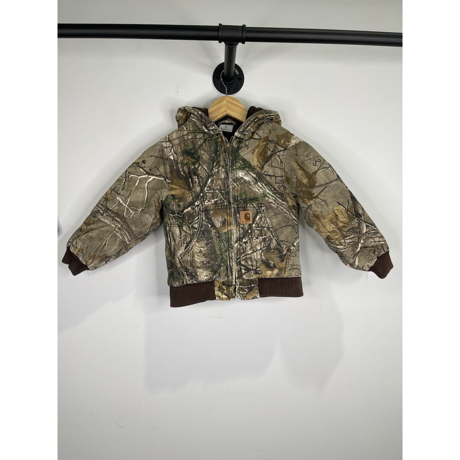 The Youth Boys Realtree Camo Carhartt Hooded Jacket in size XS (6) is a stylish and practical outerwear option for young boys. Made with 100% cotton canvas and lined with 100% polyester, this jacket is perfect for fall and winter seasons. The green camo design adds an outdoor theme to the basic jacket style, while the zip closure and hooded feature make it easy to layer and stay warm on chilly days. Perfect for active boys who love spending time outdoors, this Carhartt jacket combines durability with a fun and trendy look.