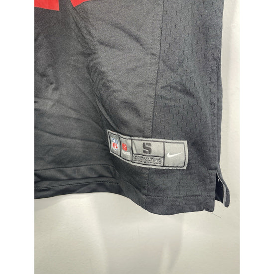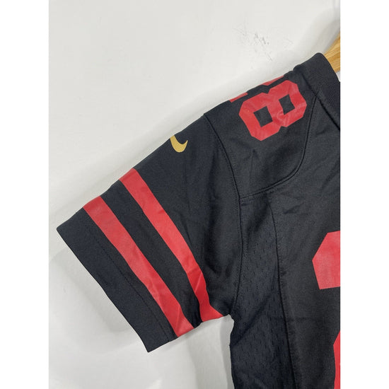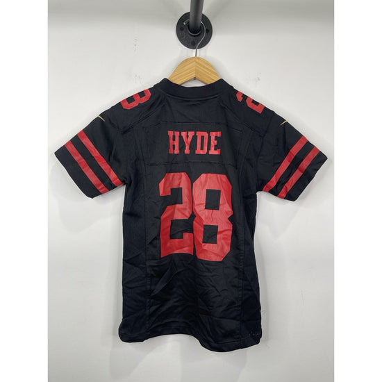The product is a Youth San Francisco 49ers NFL shirt jersey by Nike, featuring player Carlos Hyde in size Small. The shirt is officially licensed by the National Football League and is designed for men who support the San Francisco 49ers. The black jersey is perfect for fans looking to show their team spirit during the regular season games. Made by a reputable brand like Nike, this jersey is a must-have for any young football enthusiast.