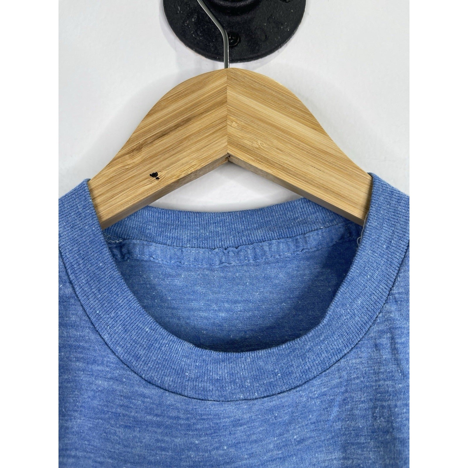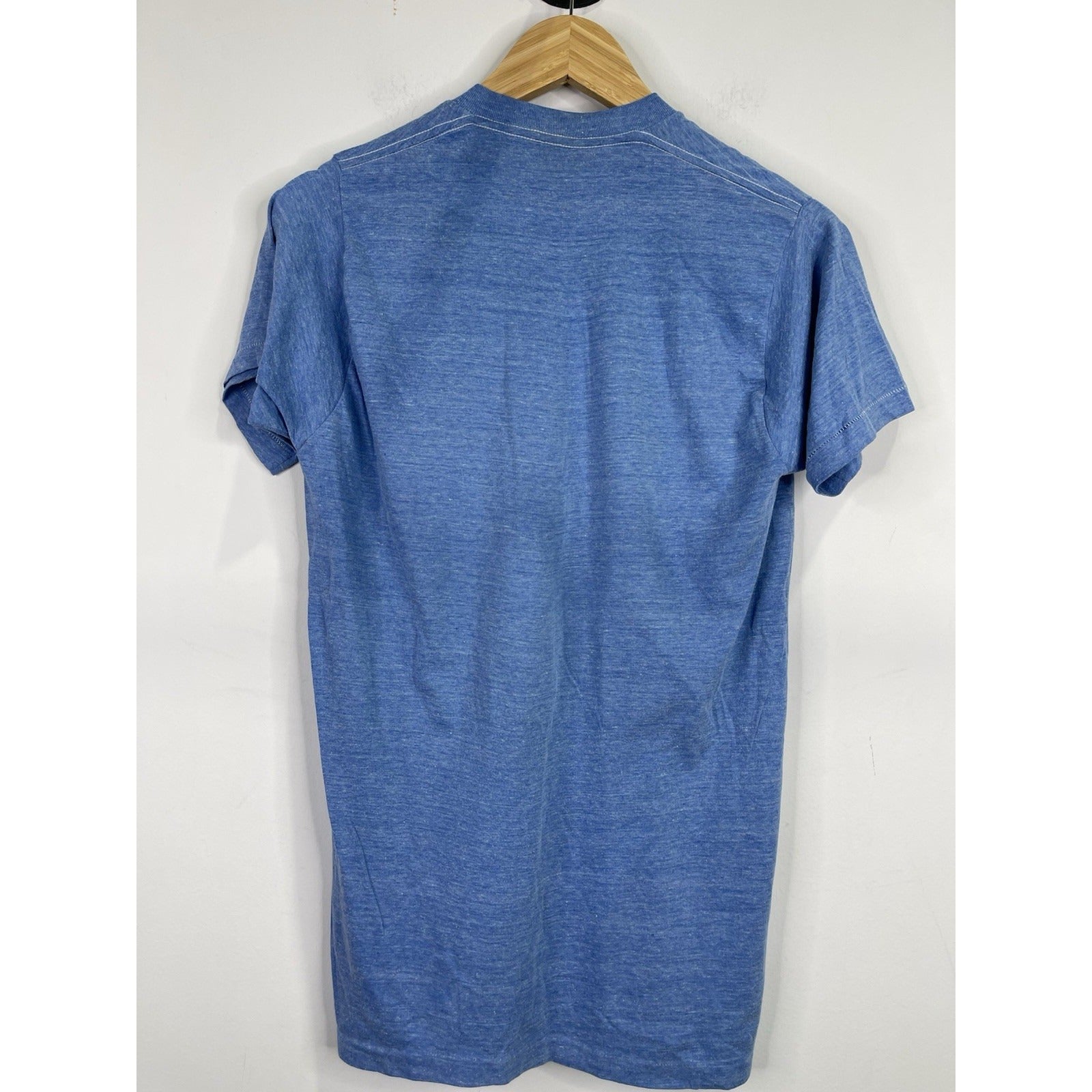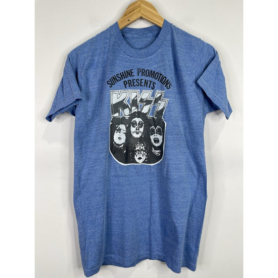 This Men’s Vintage 70s Sunshine Promotions Venue Present KISS Graphic T Shirt in size M is a classic piece perfect for any 70s enthusiast. Made of breathable cotton material, this short-sleeve t-shirt features a crew neck and a graphic print design that embodies the vibrant energy of the era. The blue color adds a pop of retro style, making it a standout piece in any wardrobe. Made in the United States, this lightweight and easy-care shirt is sure to become a comfortable and stylish staple for any man looking to add a touch of vintage flair to their look.