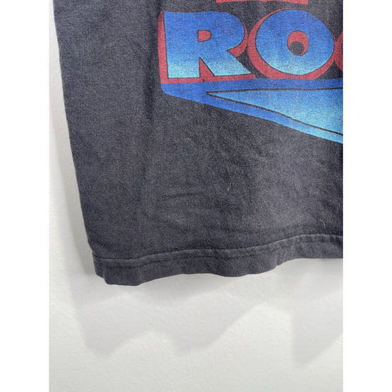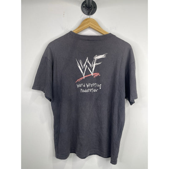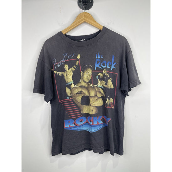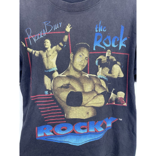 The product is a vintage Youth Rock WWF wrestling shirt featuring The Rock wrestler in a black color. It is officially licensed by WWF and comes in size XL. This ultra rare shirt is perfect for wrestling fans, particularly those who are fans of The Rock wrestler. Made for boys, this shirt would make a unique addition to any wrestling fan's collection of fan apparel and souvenirs.