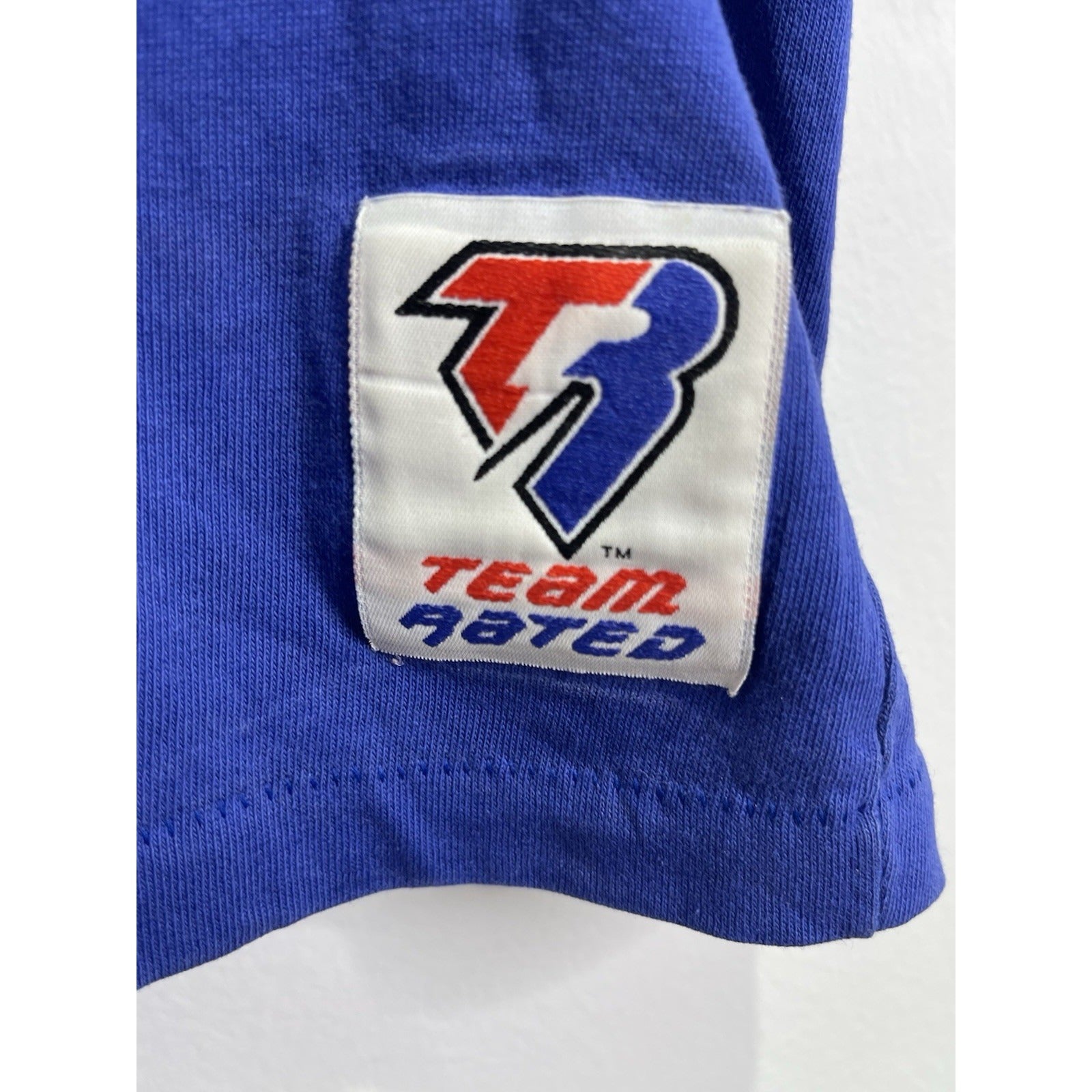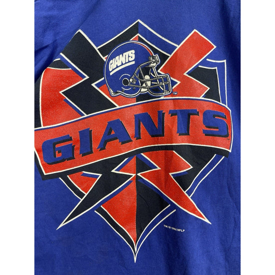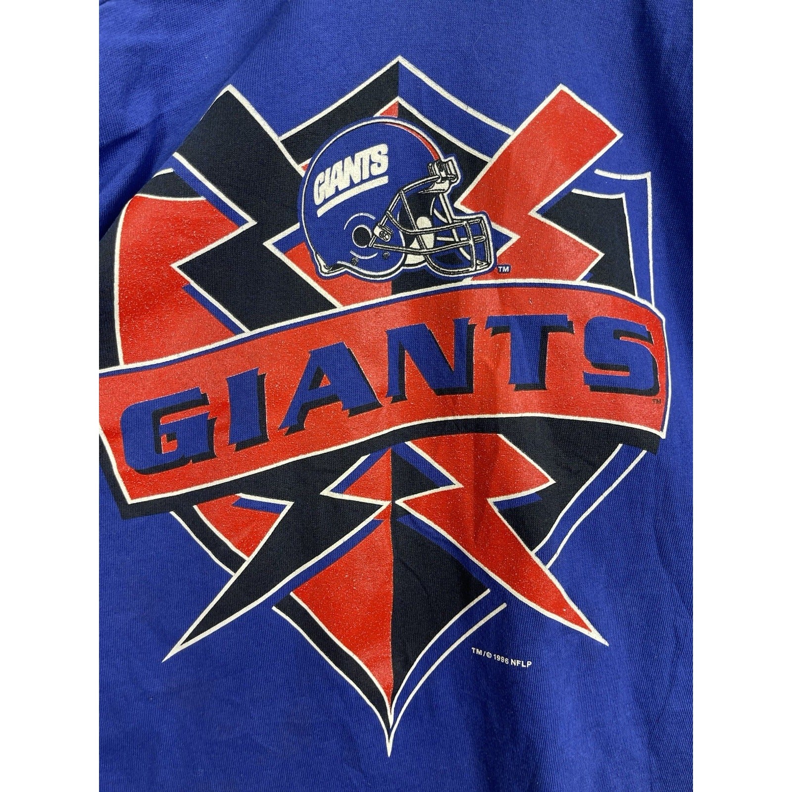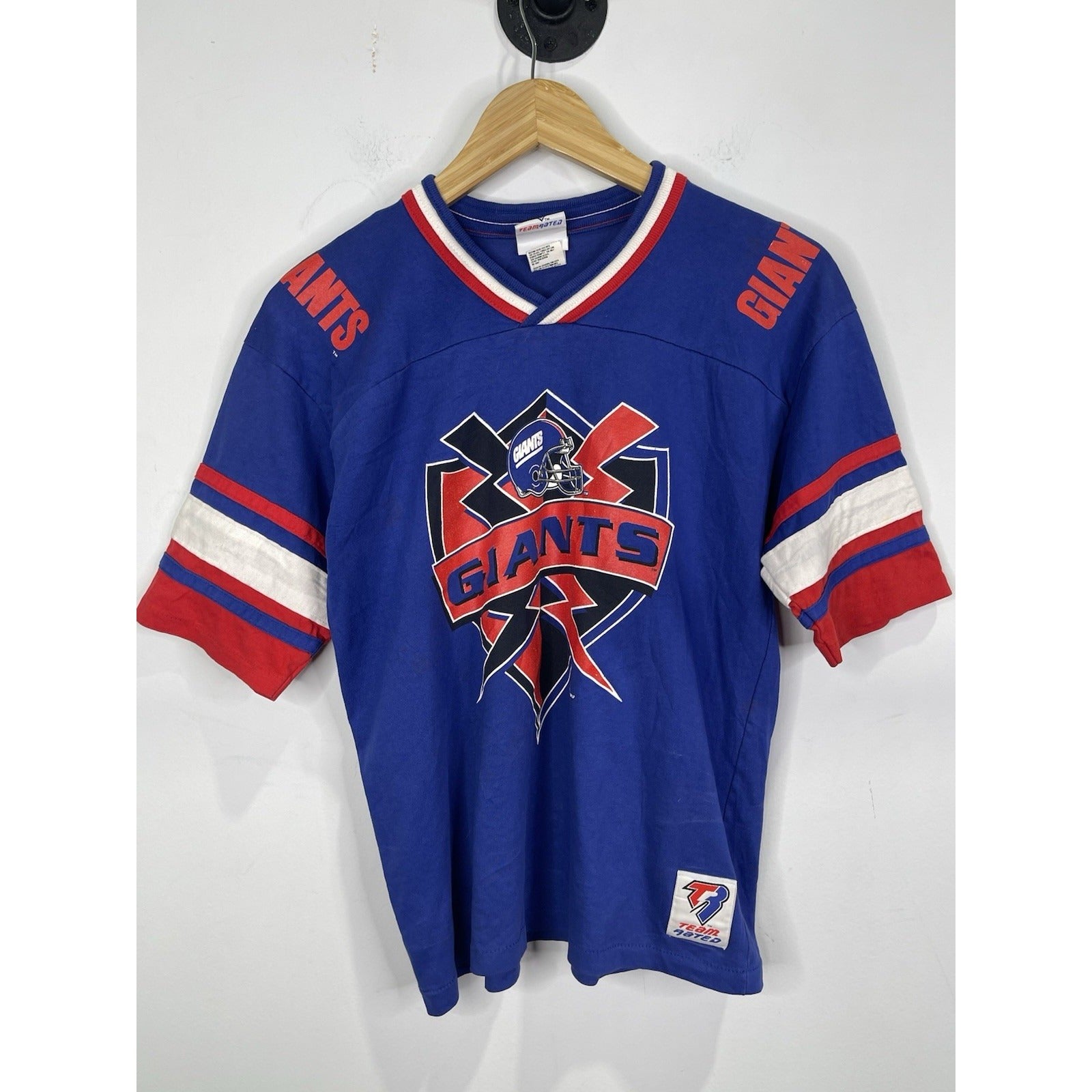 The Youth VTG New York Giants T Shirt by Salem Sportswear is a vintage 90s classic featuring an all-over print design with the iconic NFL logo. This blue short sleeve tee has a V-neckline and a pullover closure, making it perfect for young boys looking to show their team spirit. The retro theme adds a unique touch to this shirt, ideal for casual wear while walking or at school. Made by Team Rated, this graphic print shirt in size L is a nostalgic and stylish choice for young fans of the New York Giants.